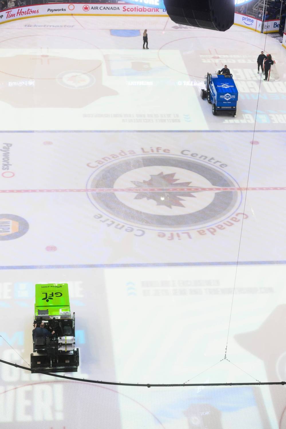 Zamboni operator Chucky clears the ice in between periods at Canada Life Centre Monday night.