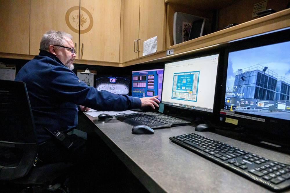 MIKE SUDOMA / FREE PRESS Director of engineering and ice operations Doug Neubauer monitors ice temperatures and other readouts from his control room during a recent game.