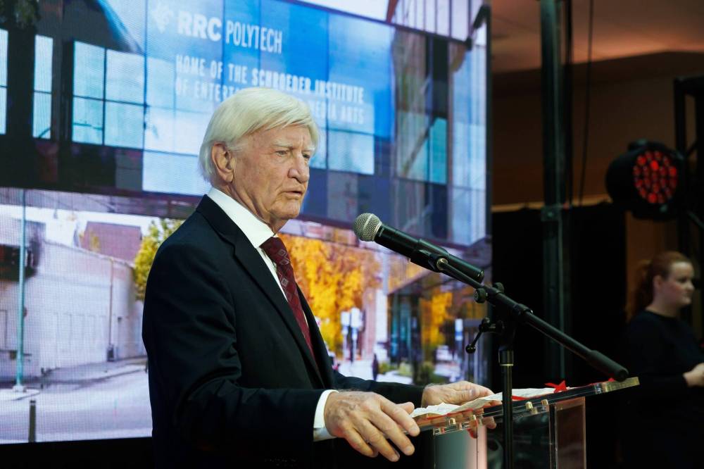 Walter Schroeder speaks at the launch of the Schroeder Institute of Entertainment and Media Arts after the donation of $15 million from Walter and Maria Schroeder through the Schroeder Foundation in 2024.
