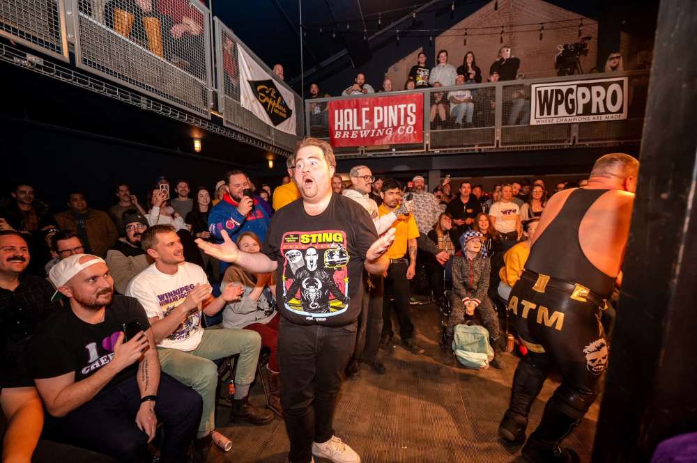 Hauser, who is in the city filming the curling-themed movie Sticks and Stones, took down former Winnipeg Professional Wrestling Champion “Bad Boy” Anderson Tyson Moore in what appeared to be an unplanned rumble during the “Stooged 2” bout at the West End Cultural Centre.