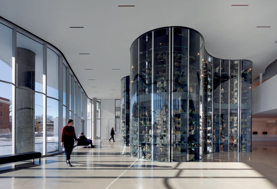 The journey of creating a dedicated space to recognize and honour Indigenous artists began in 2012, the year of the WAG’s centennial, when American architect Michael Maltzan won an international juried competition to design the WAG Inuit art centre. His design was inspired by a trip to Nunavut. The undulating white stone façade, which appears to float above the ground, recalls the scale and carved forms of the North as well as the artwork housed within.