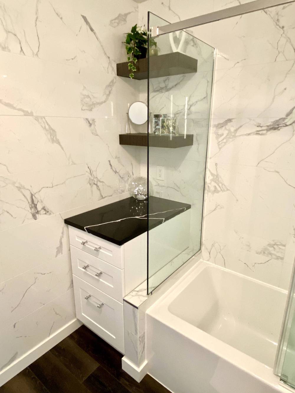 For this bathroom space, the homeowner chose a 12×24 inch white marble-esk porcelain tile set on the horizontal, to be installed floor to ceiling on all walls. Before tiling began, a small stub wall was introduced at the end of the tub, with an access panel to the tub’s motor – this provides a finished end to the front-only skirted tub. The tile was then systematically mounted on all walls throughout, accommodating any wall outlets and switches. Once grouted, the vinyl flooring was then installed, with PVC baseboards and casings. The shower amenities were then mounted, and tested.