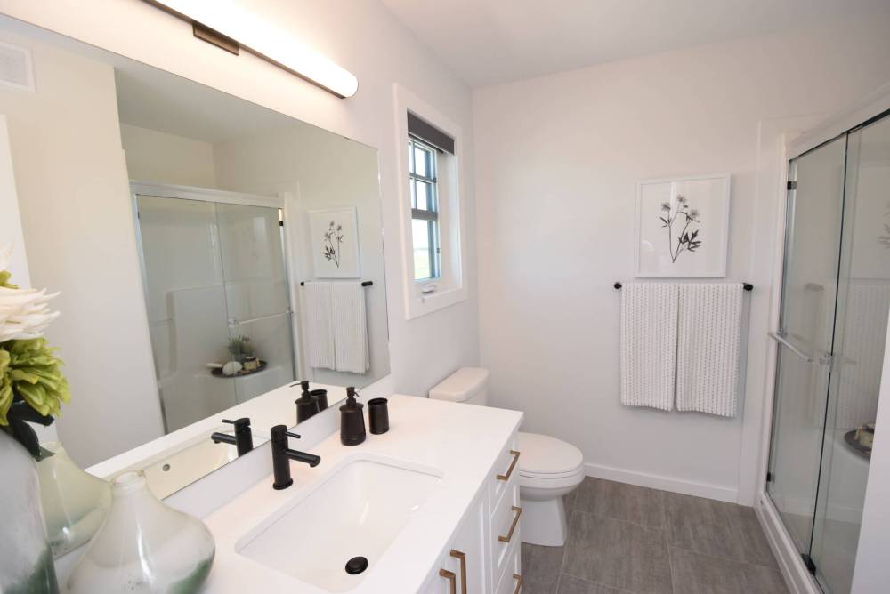 “The only upgrades would be the alarm system, wallpaper accents and appliances. Everything else comes standard, including the laminate plank flooring, window coverings, light package, and cabinets,” Klassen says.