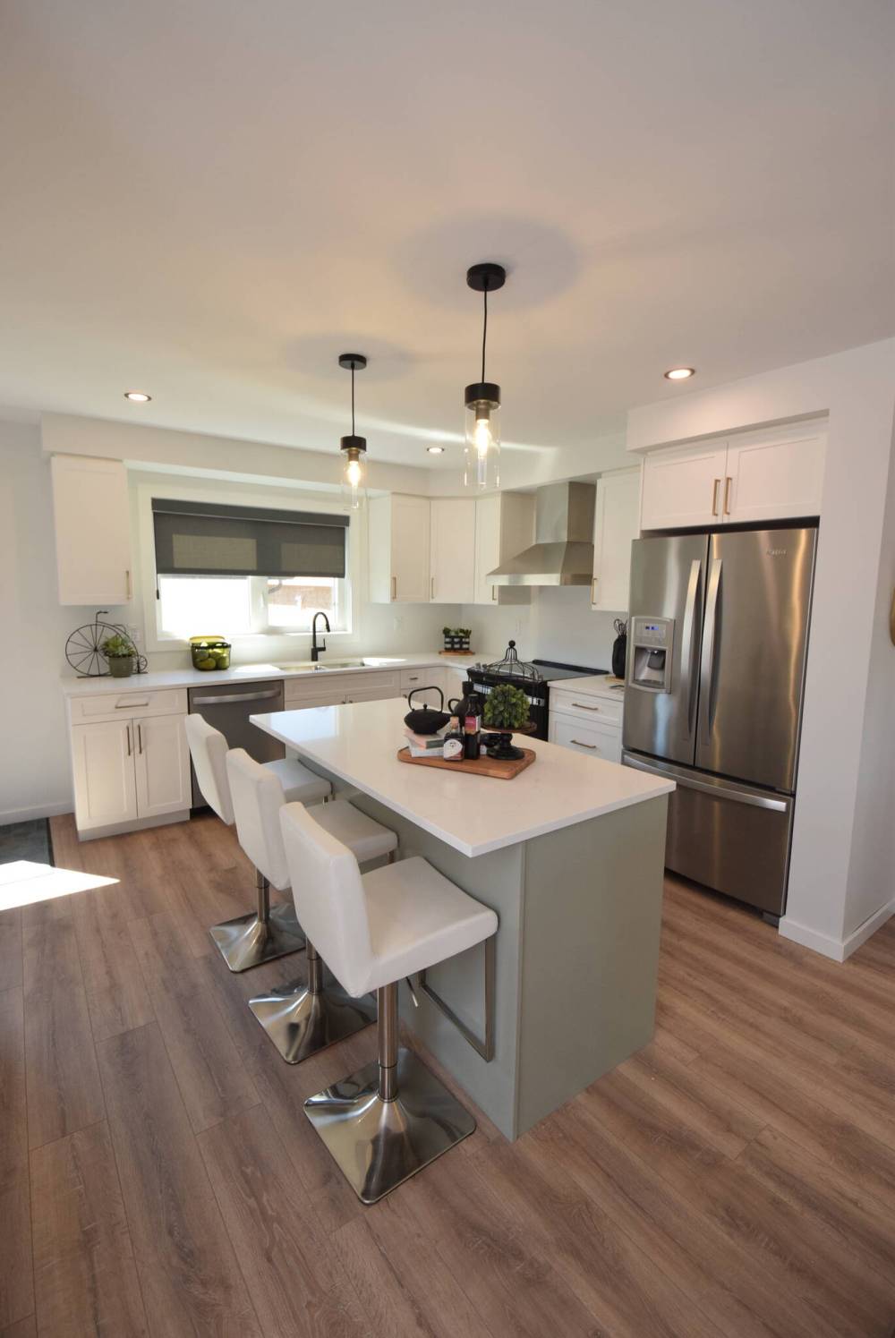 “It comes with quartz countertops, white thermofoil cabinets, a pantry, an island with contrasting grey base and an eating nook for three,” Klassen says. “Kitchens are offered in three versions: two-tone packages, and one that’s all white.”