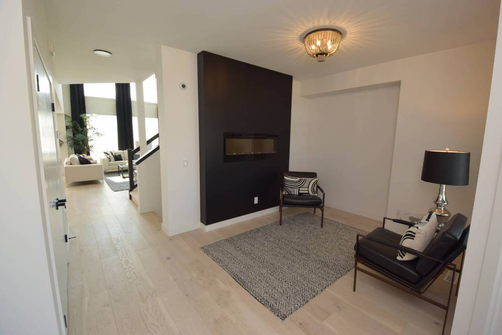 “When you walk in, the first thing you see is a space to the right of the front door with a linear electric fireplace set in a black feature wall that immediately catches your attention. It’s a great space that can be used as either a sitting room or formal dining room.”