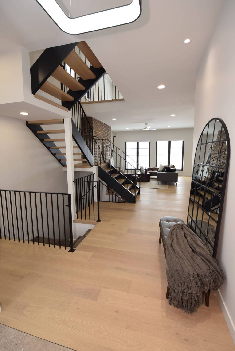 The spacious foyer is functional and fantastic with its striking open-riser staircase.