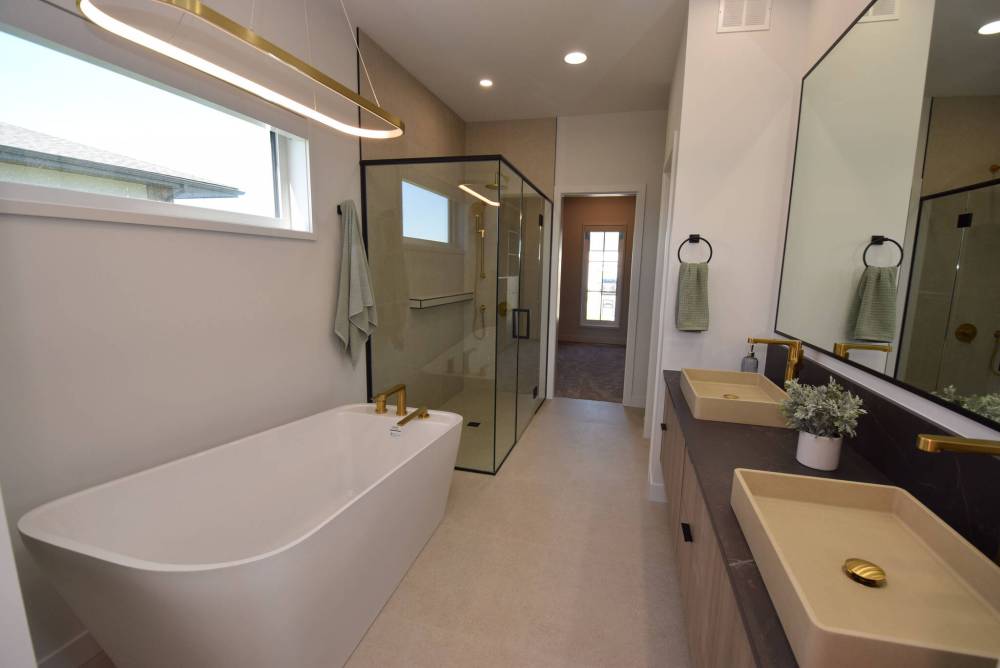 “It’s a spa-inspired space that offers a soaker tub, curb-less tiled shower, double vanity and huge custom walk-in closet. The bedroom is a welcoming, sun-filled retreat.”