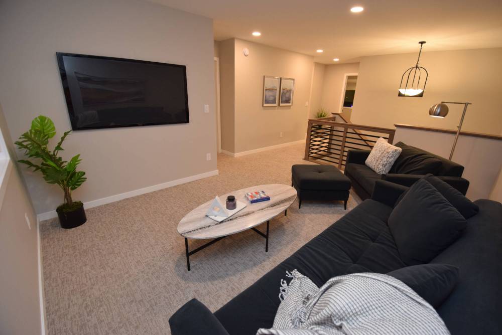 “Again, the layout is amazing,” says Moran. “It allowed for a huge loft to the left of the stairs that’s defined by the beautiful railing and spindles — a space that can be used as a play area and a spot for kids to watch TV in their own separate space. There’s also a wing to the right that holds three bedrooms, a four-piece bath and a big laundry room.”