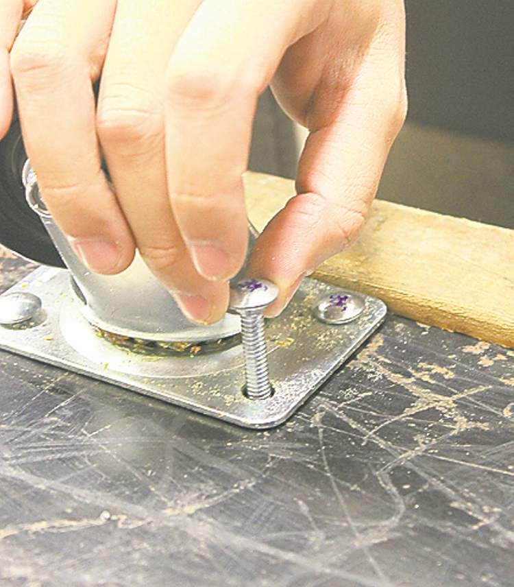 Step 2: Align the caster wheels with the holes and pass the bolts through the holes and secure with a washer and nut