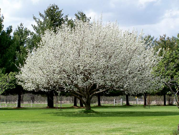 The pear is the largest of all the Prairie fruit trees and can be grown effectively as a small- to medium-sized shade tree. Pears are very cold hardy and tolerate our alkaline, clay soils. The fruit of Prairie cultivars is smaller and of lesser quality than store-bought selections like Bartlett. Nevertheless, hybrid cultivars such as Early Gold and Ure produce consistent yields of tasty, golden, 5 cm fruit.