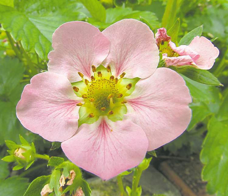 Teresa Lopata Day-neutral strawberry plants produce very attractive large pink flowers.