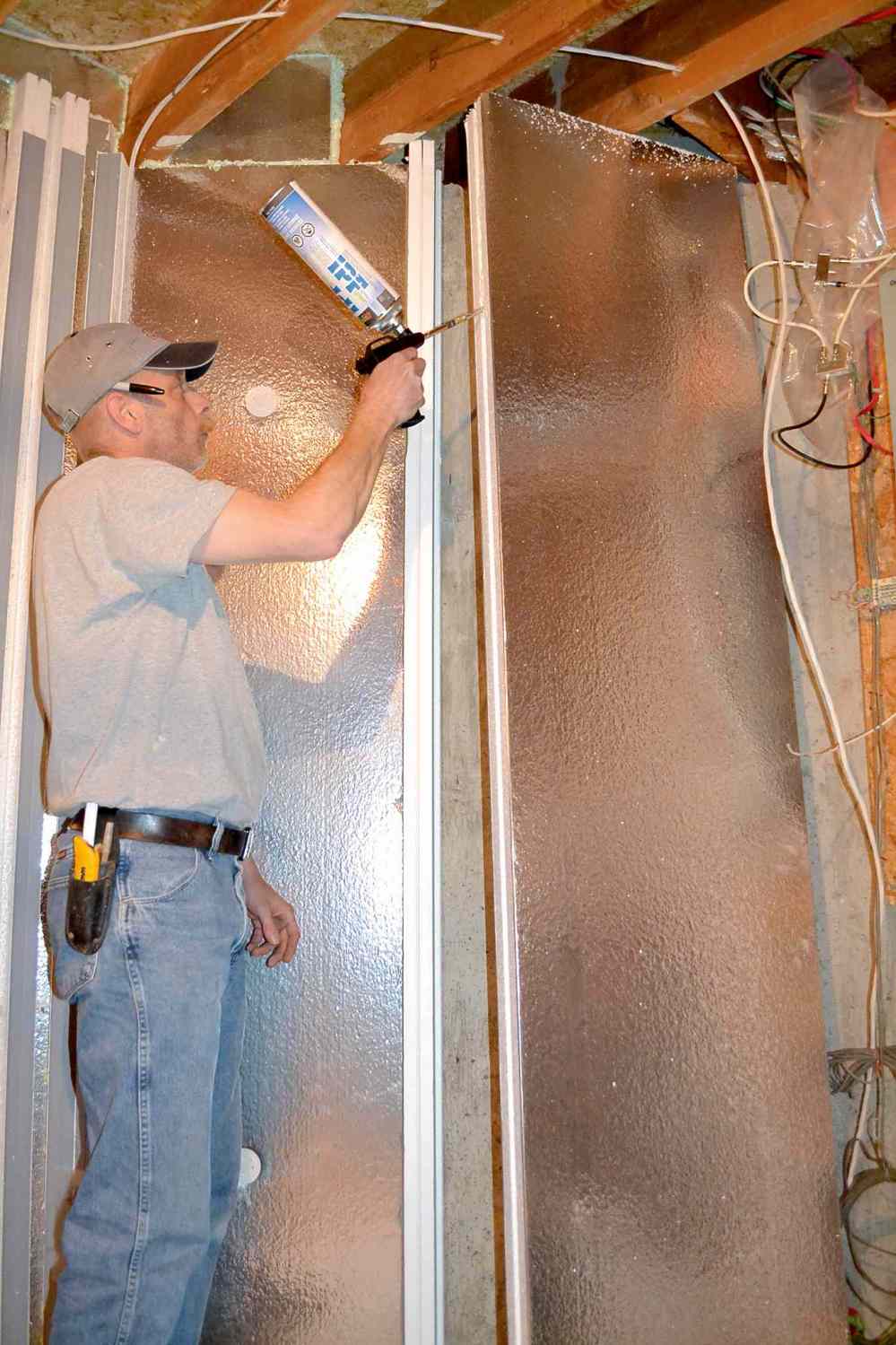 Cullen said the bottom edges of the studs and panels rest on a foam gasket (sold in rolls), that has sufficient elasticity to compress and maintain a tight seal if the basement floor shifts.