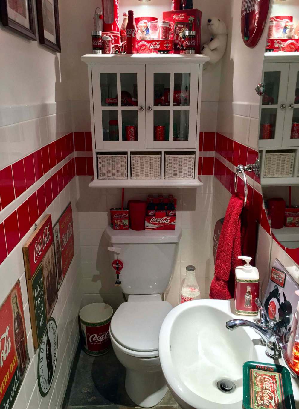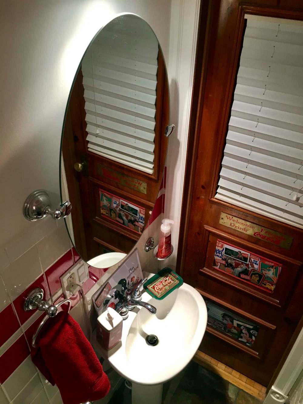 Shortly after starting this renovation, I stumbled upon a storage bin while rummaging in the basement — it was filled with forgotten Coca-Cola memorabilia. And with this haphazard discovery, ideas for the main-floor bathroom’s decor emerged like a lost treasure. It would be a theme bathroom, with walls of red and white tile, like an old 50’s style diner, and would be littered, of course, with Coke stuff everywhere!