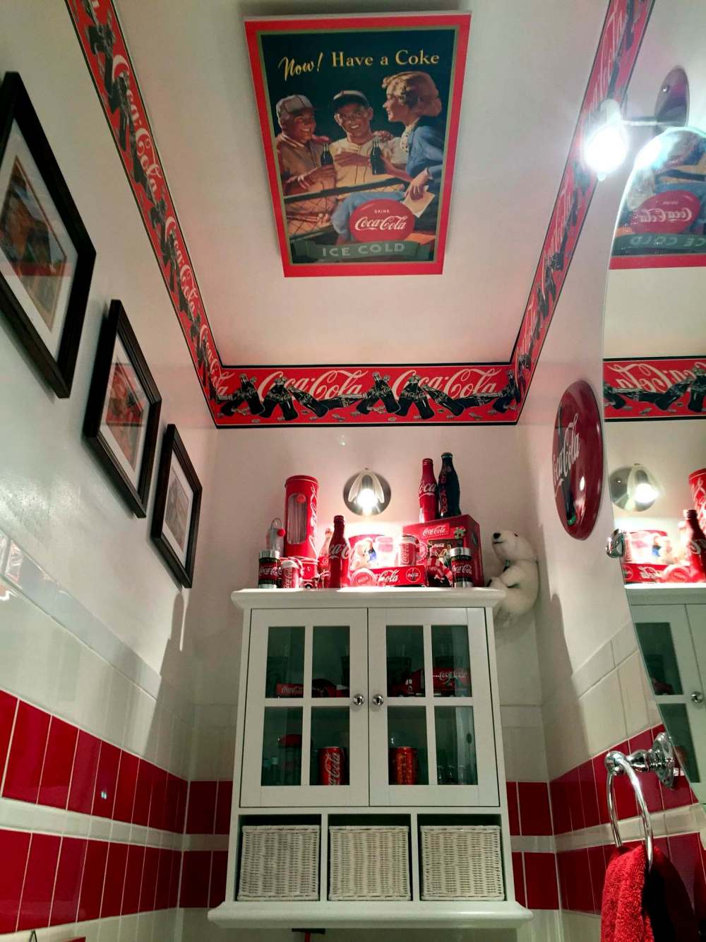 Although the pre-ornate version of the bathroom was clean and pleasing to the eye, the real fun began once that box of Coca-Cola memorabilia was opened. One by one, each of the Coke items that had been hidden away for so long was given purpose — a permanent home on display within this newly renovated space. A Coca-Cola wallpaper border showcases the upper portion of the wall adjacent to the ceiling, and a block-mounted poster facing downward offsets the simplicity of an otherwise bland and bare ceiling.
