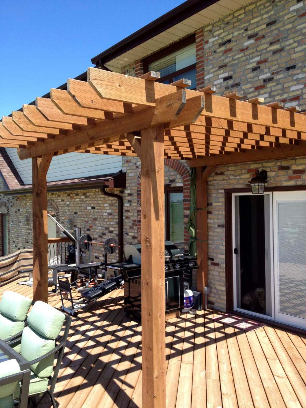 The pergola on my back deck is quite ‘typical’: perpendicular rows of equidistant two-by-fours above the main veins create a checkered look. And although most pergolas don’t have a roof, the checkered cross-veins still manage to create a good amount of shade — after a long day under the sun, shade near the barbecue area is quite welcome. The pergola design over my front porch is basically the same, with one minor difference: the veins flare out in width slightly. Both pergolas are secured to my house, which makes them relatively easy to build and very sturdy.