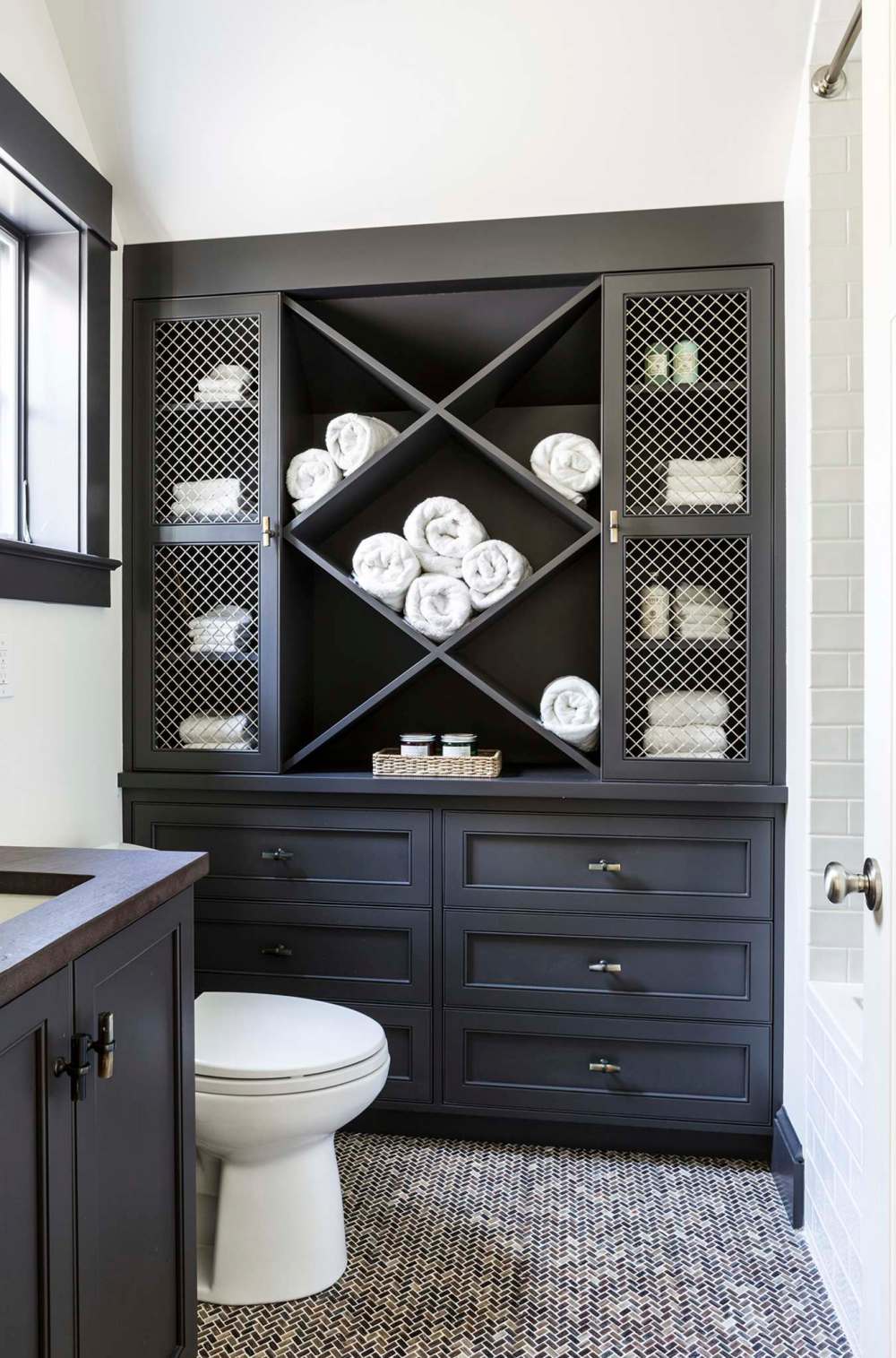 Answer: I have small bathrooms in my home, and my advice would be to take advantage of your vertical space. Just yesterday we were planning a small bath space and discussing using a train rack that hangs high enough to store your towels and includes hooks along the bottom rung. Another thing to consider is a frameless glass door on your shower. This will immediately make the space feel larger and diffuse the light. If you have any wall space behind your toilet, install a recessed medicine cabinet. We recently designed a very small bathroom where we placed a medicine cabinet over the sink and a second one over the toilet with a sconce in between, which allowed the husband and wife to have everything they needed on one wall. Another space-saving tip we implement all the time: reverse the swing of the door or, if possible, install a pocket door. Both of these save an incredible amount of space in a small bathroom.