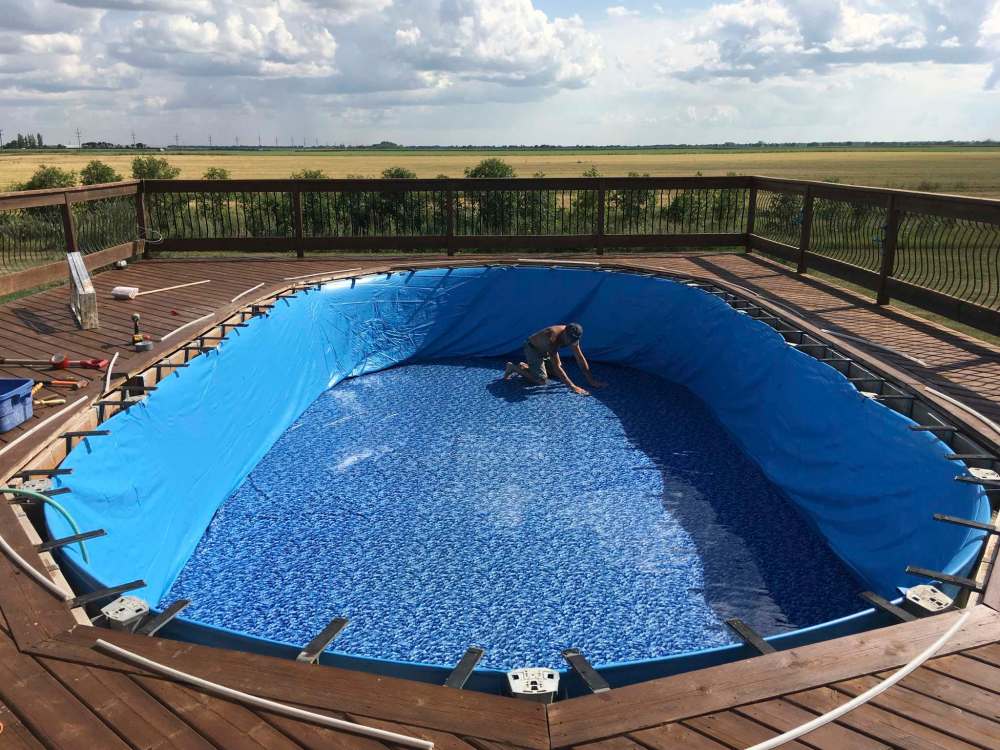 Erecting a wall for an above-ground pool is a weather-dependent process — it can’t be achieved on a windy day. We were fortunate all weekend as there was just a slight breeze in the air. The wall was unravelled and the skimmer cut-out was located.