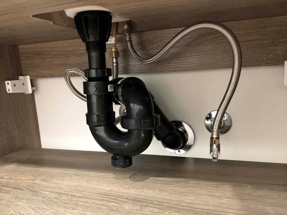 Don Kennedy’s lower level, below the counter the ABS trap, and mesh hoses attached to PEX shut-off valves for a bar sink installed atop an arbrite countertop.
