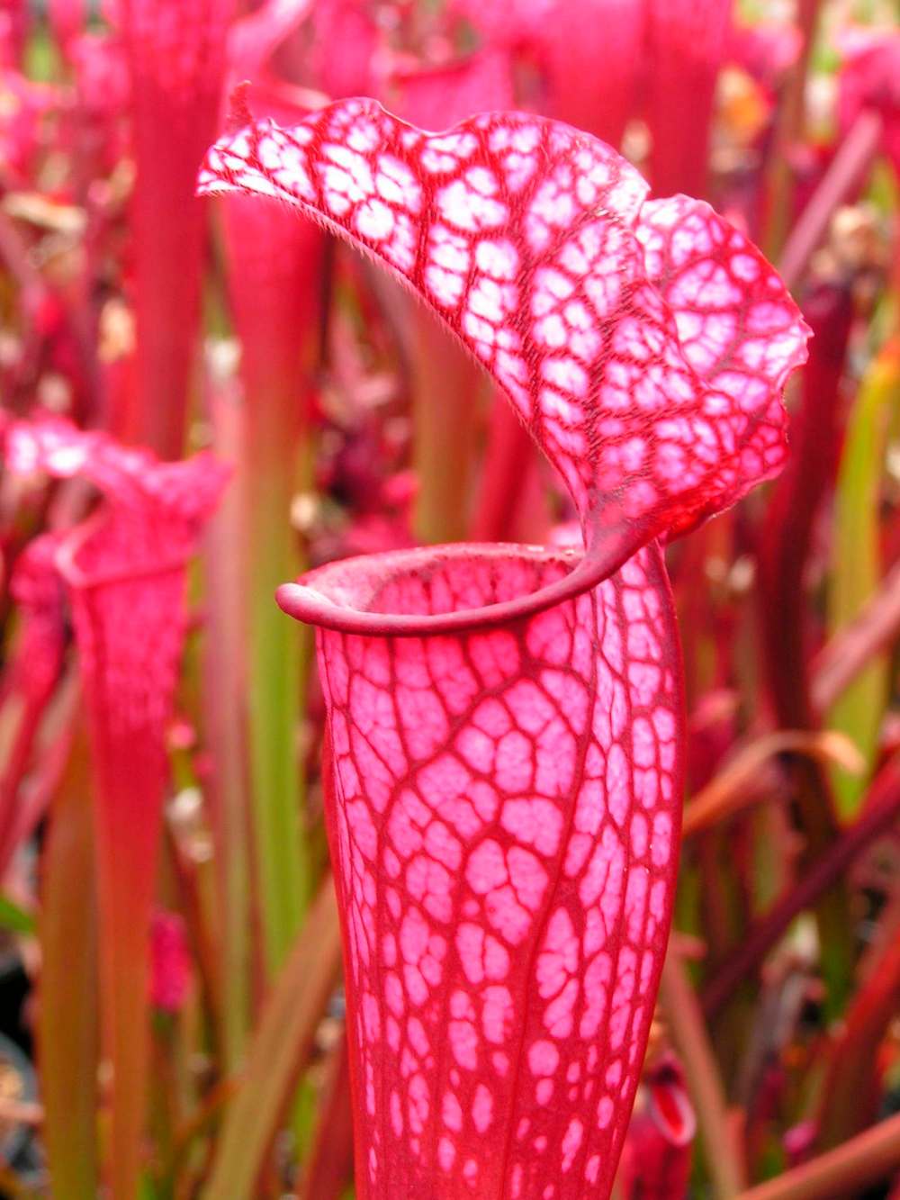 Walstrom recommends another plant option that ingests tiny pests in its long-throated reservoir. Sarracenia Dana’s Delight is a cultivar of the carnivorous pitcher plant. It has prominent, deep pink veins and a ruffled hood with sweet smelling nectar on the rim that attracts fungus gnats and other insects.