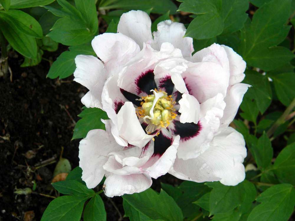 Venton grows Boundless Bright Sky tree peony, which has double creamy white blooms and mesmerizing dark maroon rockii flares at the base of the petals. Venton planted Boundless Bright Sky just two years ago. Currently, it is just 30 cm tall, but it will grow as it matures. Older tree peonies in her garden are as much as 60 cm in height.