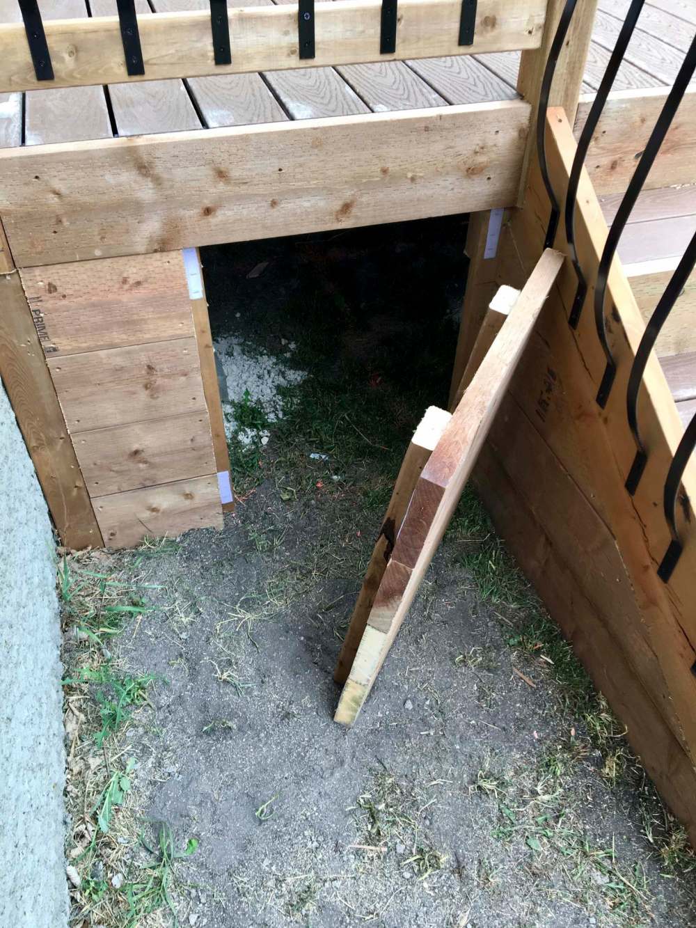 Railing would grace the long of the deck until the stairs began on the far end near the heel of the L. Due to the height of the deck, four stairs were required. The stairs continued along the entire front side of the deck facing the yard, and wrapped slightly along the short of the L where railing was once again introduced.