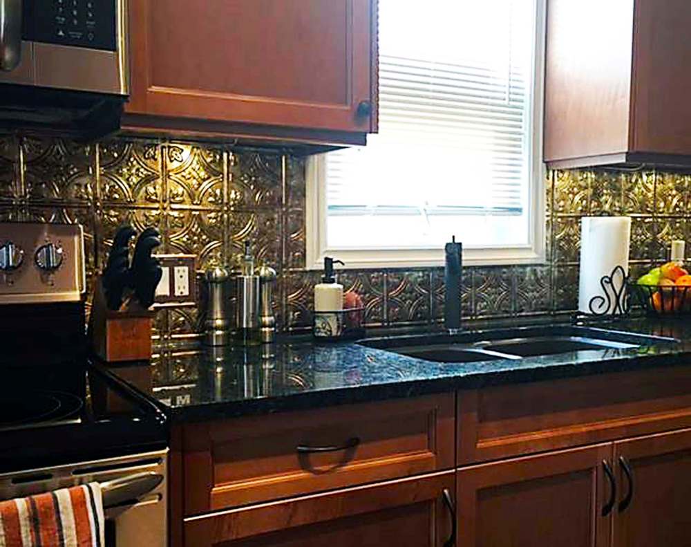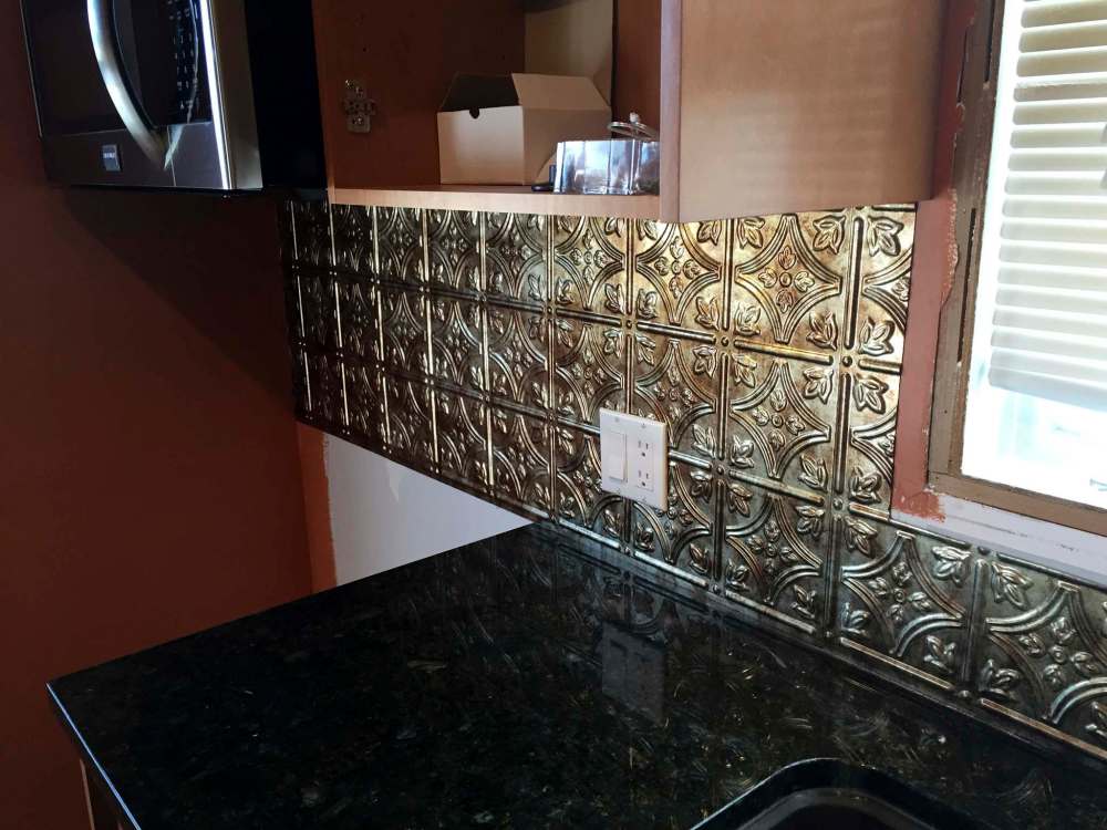 My client had very specific design intentions for her kitchen, revolving around a Mexican-themed decor. The backsplash in her mind was also the focal point — gold plastic embossed 24×24-inch panels. They were a bold choice, and would require an alternative method of installation.