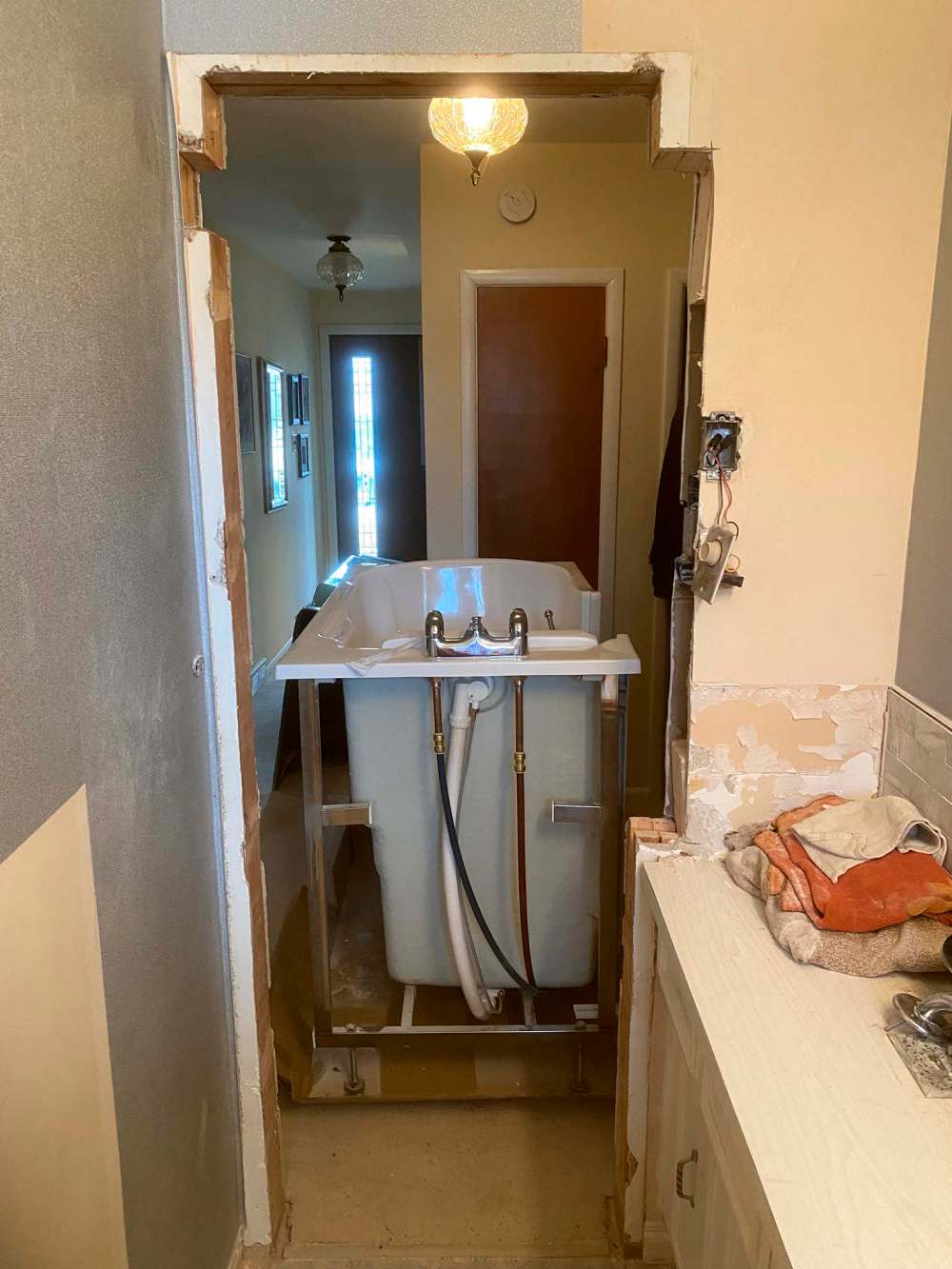 By first removing the 24-inch bathroom door and jamb, the exposed rough opening allowed for roughly 26 inches in width. And since the built-in vanity front is in line with the rough opening, it was necessary to widen an area above the countertop. The tub could then be hoisted up, to pass through the opening. To gain another three inches, the doubled stud on the vanity side, along with the plaster on front and back of the walls, was removed to a height of 42 inches above the vanity top. Luckily, this did not affect any of the existing wiring for the bathroom light switch located in the hall, nor the exhaust fan timer in the bathroom. With this step completed, the opening was now 29-inches.