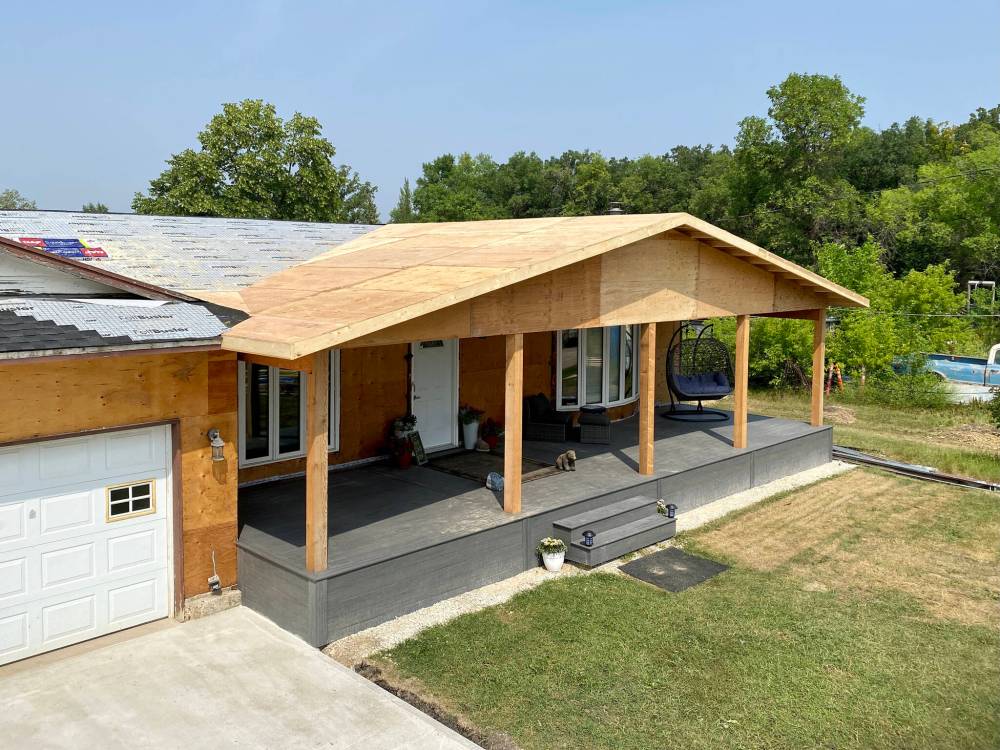 Sometime mid-spring, the next phase of the front porch-deck and roofline would begin. The two outer 6×6 fir posts were set into position, allowing the installation of the main laminated LVL beams on either side. These beams are supported along the front face of the exterior wall, and the two outer posts that sit directly atop the main beam, and helical pile below. Three temporary inner post decoys were placed along the front of the deck’s framework, and the decorative composite top-decking and fascia was installed throughout. Once this step was completed, focus would be placed onto erecting the new roofline. That’s when a major issue presented itself.