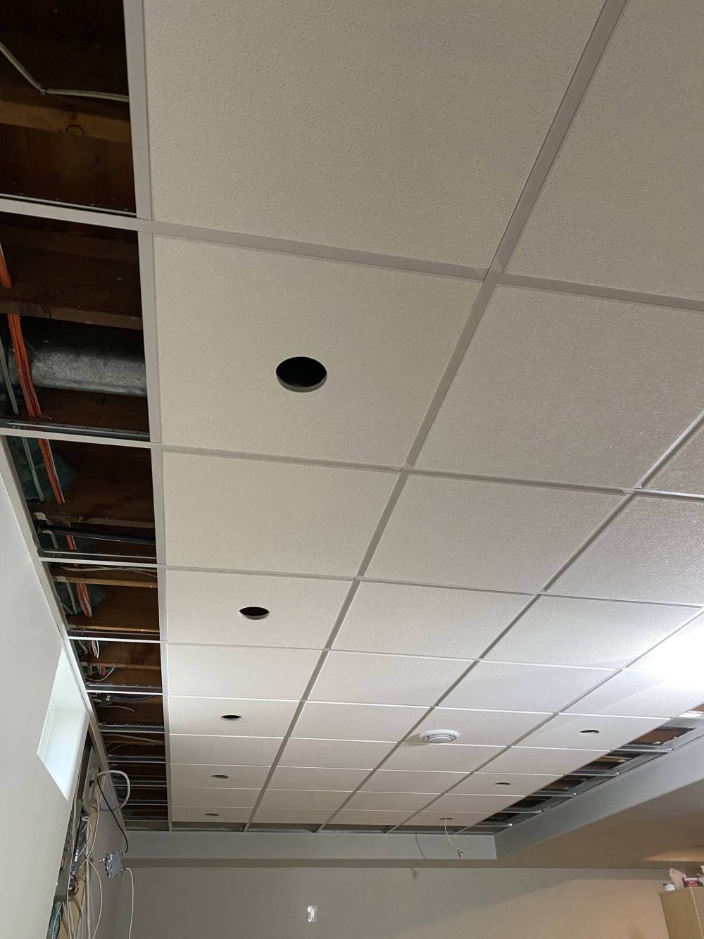 In most basements, access to services run below and through the above floor joists is imperative. Although strapping an entire area for the subsequent mounting of drywall can also be achieved, this process would involve lacing the ceiling with a series a potentially unsightly access panels whereas suspended tiles provide access throughout. For suspended ceilings, the initial determination the grid; layout and elevation.