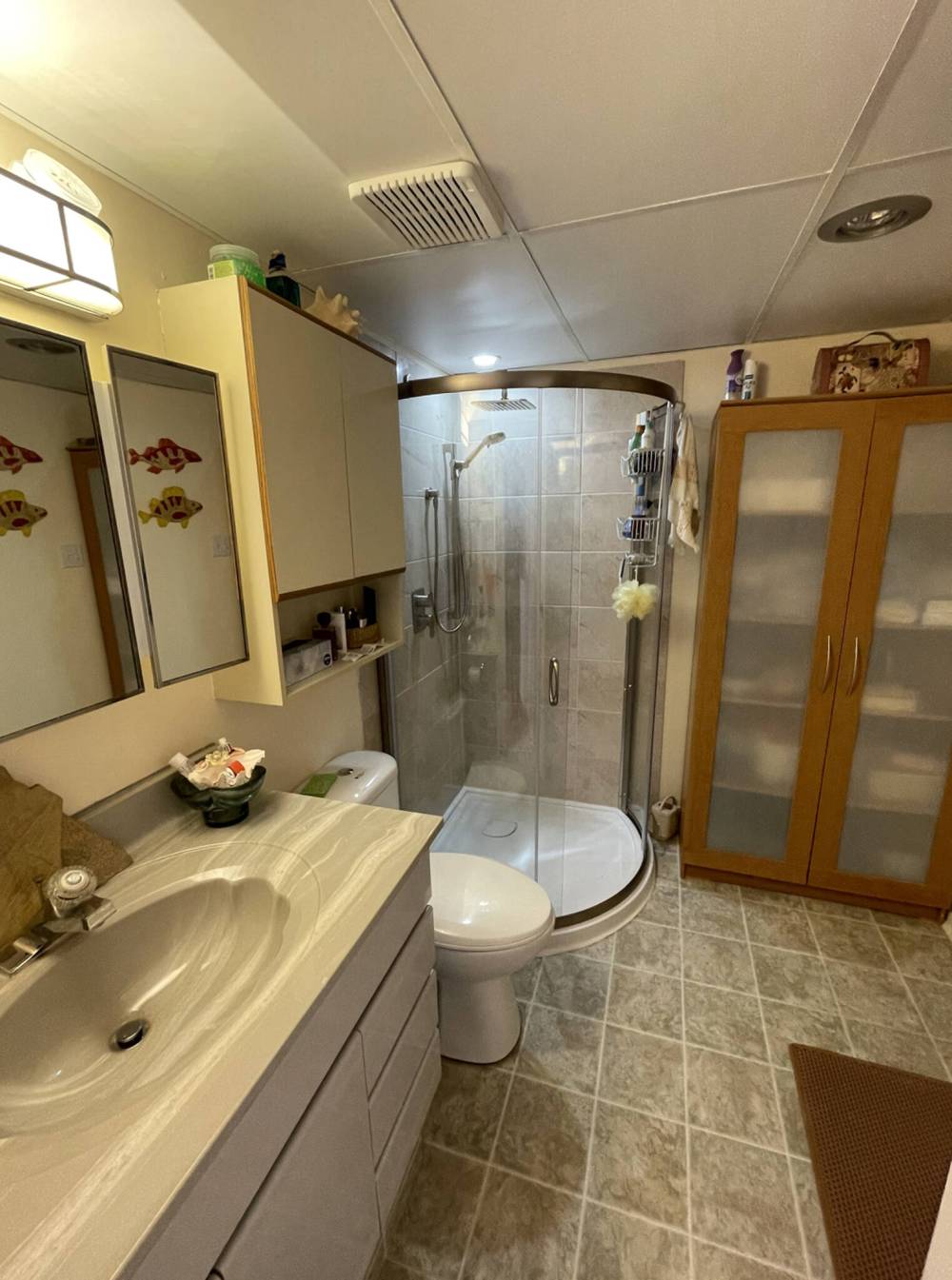 Lastly, the shower base was siliconed along the vinyl flooring, to prevent and water from seeping into and under the base, especially where shimmed. Due to the extreme slope of the basement floor (near the main floor drain in the adjacent utility and laundry room), a substantial amount of white silicone was used, gradually building the bead along the largest gap to provide a consistent look from one wall to the other, along the curvature of the shower base front. A few days later, the homeowner chose a suitable colour for the walls and painted the entire space, before repopulating the bathroom for use.