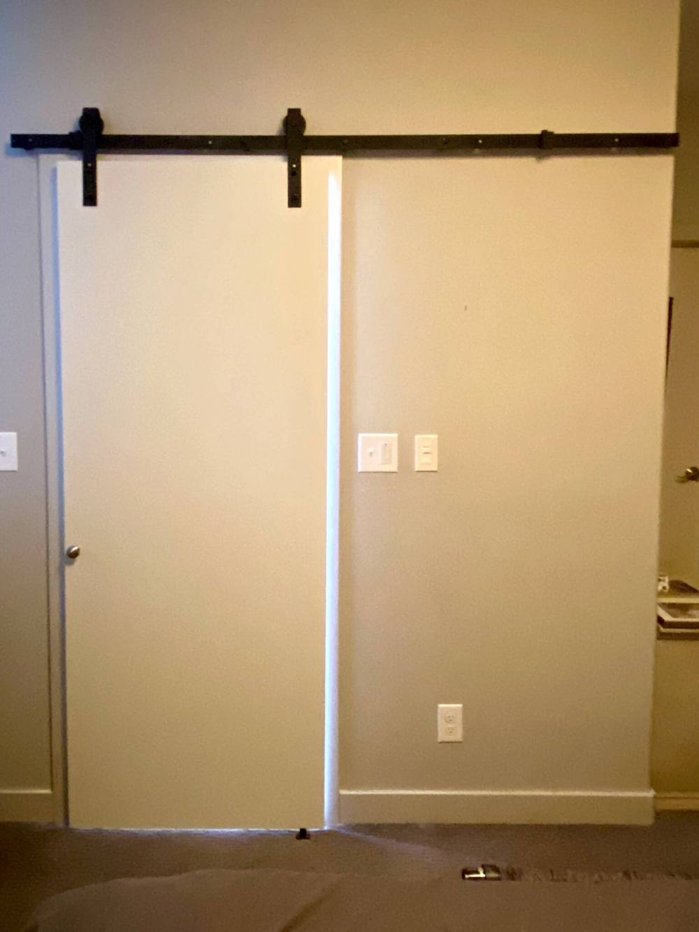 Unfortunately, and despite having the original paint codes, the new gallon did not match properly with the feature wall colour. As such, the entire wall was completely repainted to avoid any unwanted and visible brush strokes. This became an on-going theme in all touch-up locations — a very frustrating experience when paint simply does not match, even with the appropriate paint codes (likely due to fading over time). With the new upper completed, both pre-ordered solid-core barn doors were also pre-painted prior to installation — always good to get the painting done all at once.