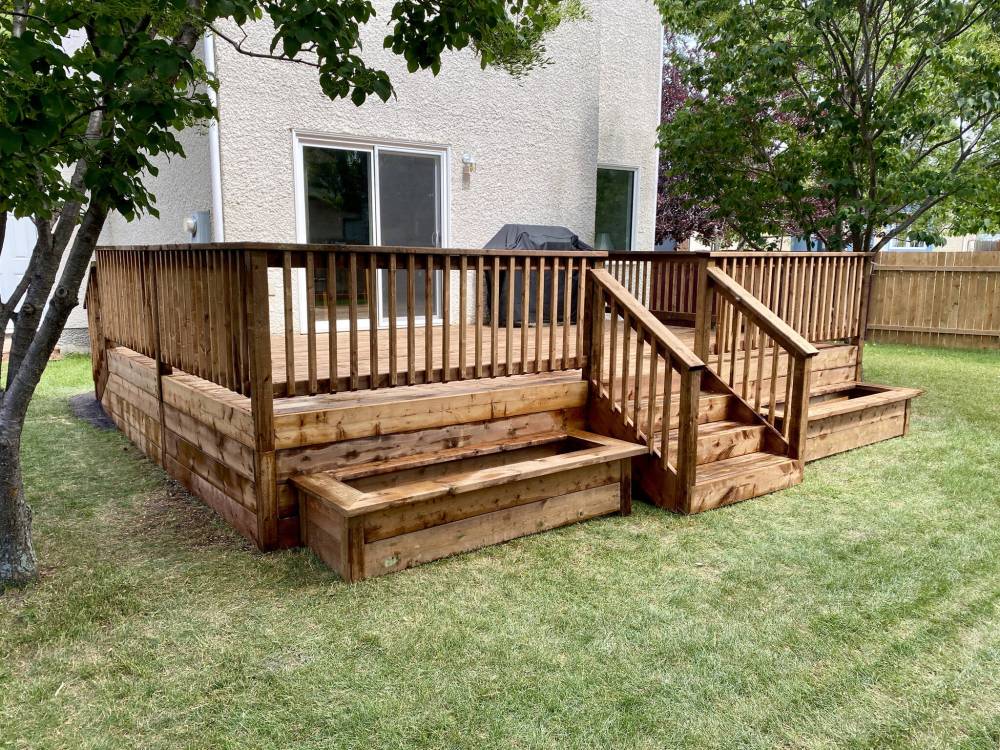 With the main structure once again sound, new staircases were fabricated on site by cutting custom stringers. The stairs at the back access would not change in width. However, a new four-foot staircase was introduced along the front side of the rectangular deck to provide easy access to the big of the yard. To fulfil the homeowners’ request, two planter boxes would also be introduced, one on either side of the centred staircase.