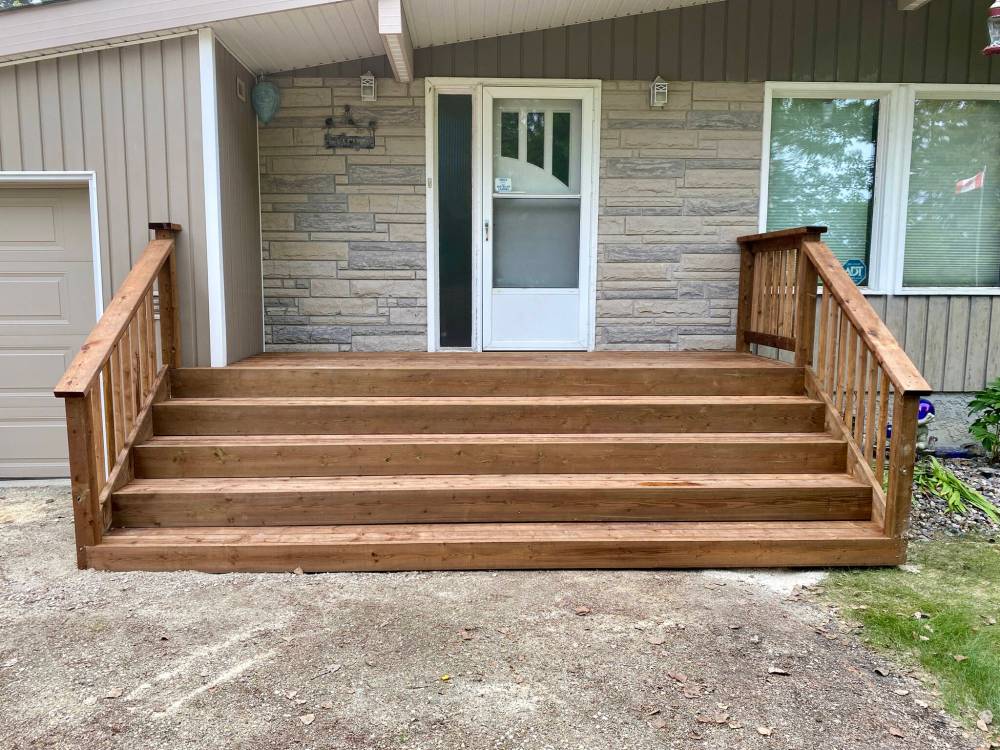 However, the cost to remove and replace old concrete steps can be prohibitive. As such, and depending on certain criteria, the old concrete steps can be salvaged and used as support for a new lumber-based front landing and stair access that will eliminate any slope, as well as transition the area from eyesore to focal point for optimizing curb appeal.