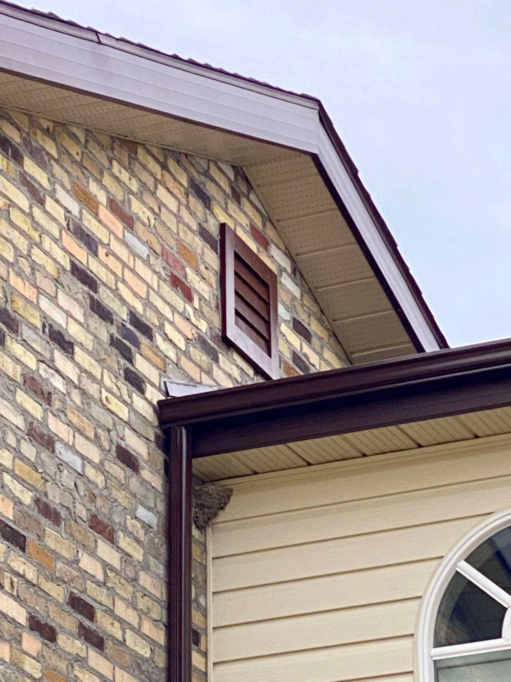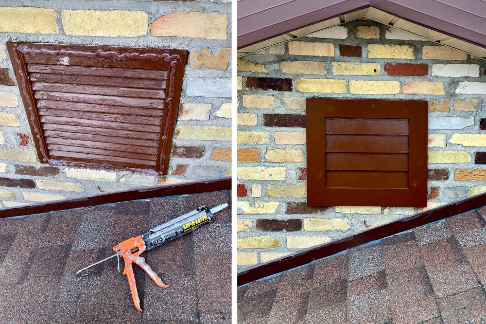 The failing and no longer needed wooden gable vent is abandoned and covered with a faux-louvred vent cap.