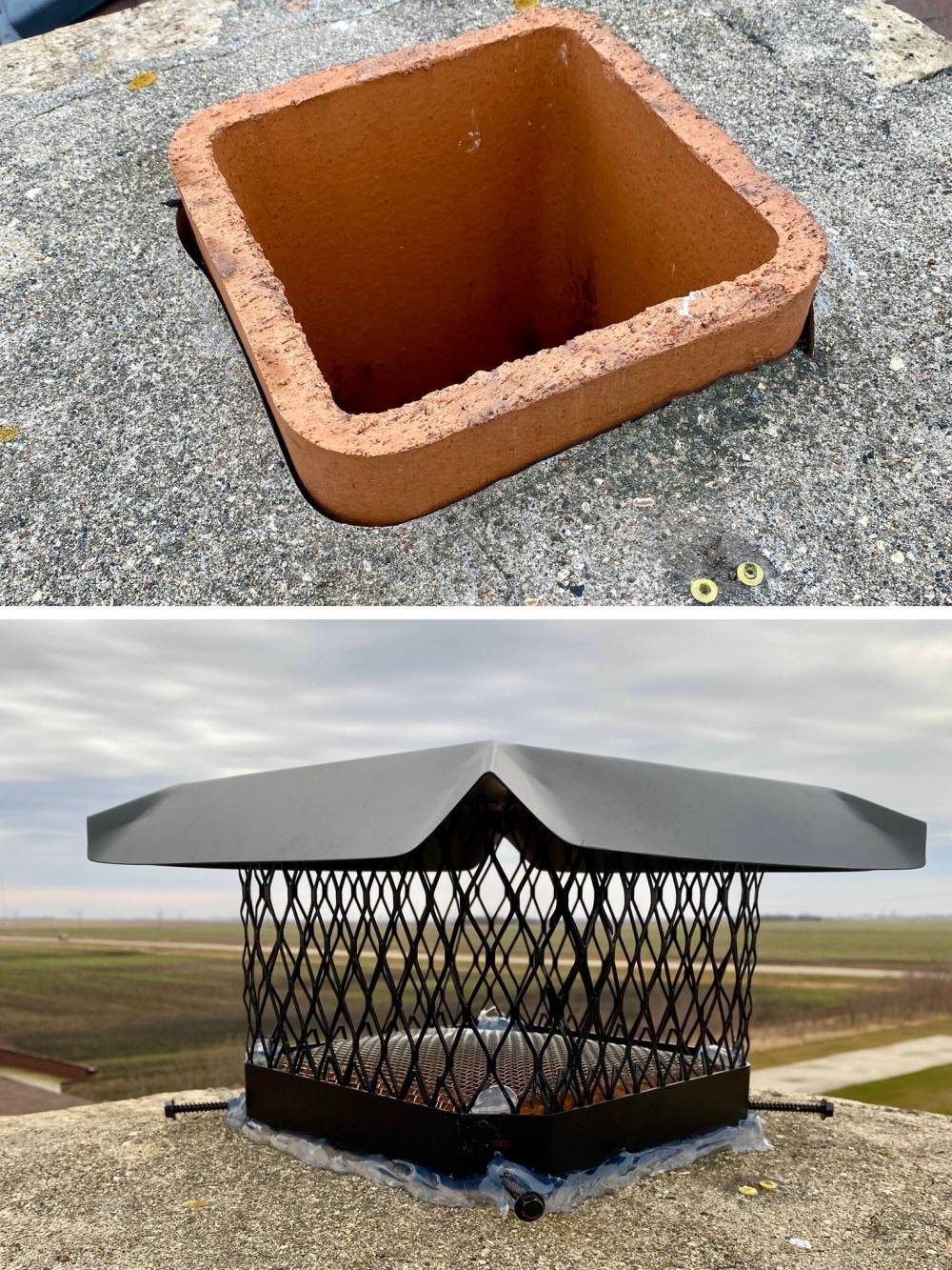 As such, I elected to update this homemade grid flue cover with a better-suited chimney cap. The cap selected has a similar vertical grid, but also provides a true cap top that also prevents a good portion of moisture from entering the flue and chimney, which is now sealed to the basement.
