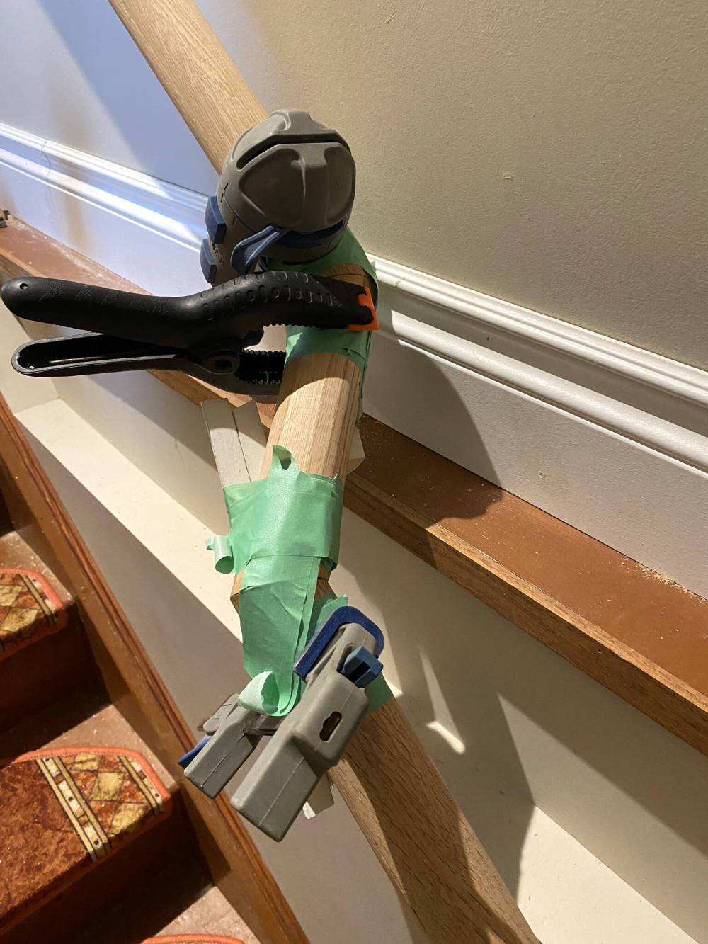 I had greatly underestimated the volume of work involved in creating a custom handrail to accommodate a vertical deviation from plumb. What I initially anticipated to take a few hours ended up lingering on over several days with some extremely tricky hurdles to overcome. The greatest challenge was how to properly ensure the mitred sections of oak rail remained rigid as they set with adhesive.