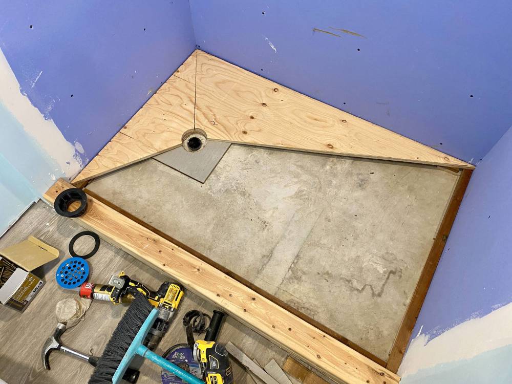 Next, a one-and-a-half-inch perimeter is introduced along the inner walls of the base location, including the curb, using two-by-twos fastened to the existing sub-floor. This creates the necessary slope that compels water to flow toward the drain.