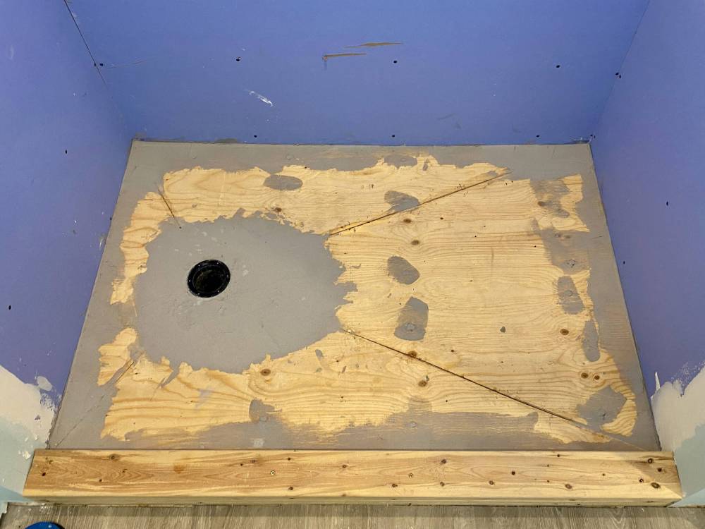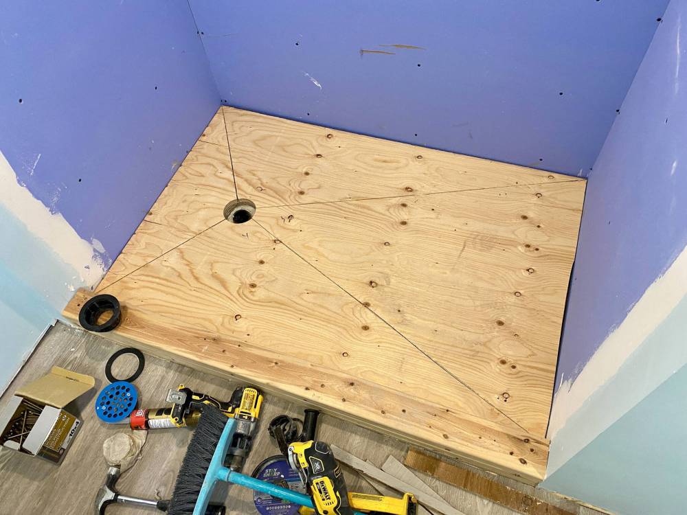The shower base (above) is fitted with waterproof cloth and glued to the sloped plywood base below. Pie-shaped plywood pieces (right) introduce a slope toward the drain.
