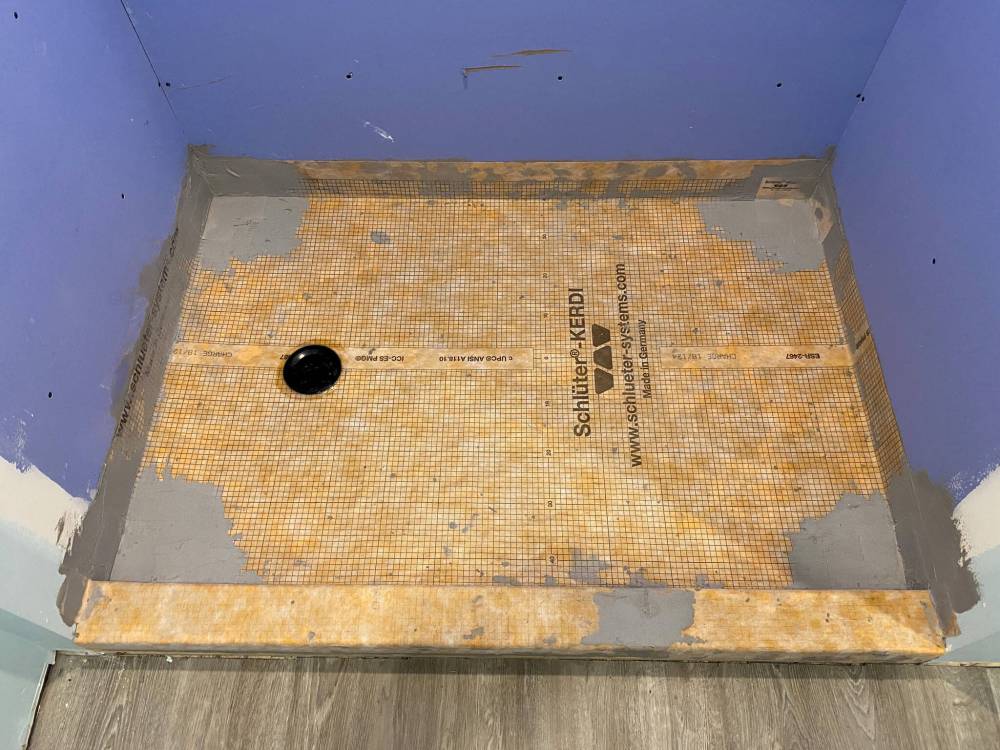 Before applying the waterproof cloth, the seams and imperfections are smoothed out using quick-set thinset.