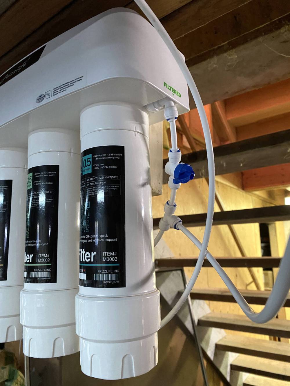 Despite the flimsy nature of the plastic fittings supplied with the RO system, it appeared the entire array of three-eighth-inch water lines was void of leaks at every junction. The coffee bar faucet was then fully functional, as were the lines to both dispensing fridges.
