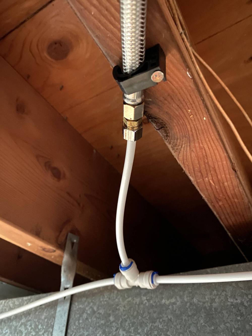 Once the main cold feed was adapted with a fitting for conversion, the line was fed toward the pre-mounted RO system. A shut-off was introduced before the system, and another as the filtered water leaves the unit. From that point, the main line branches into two: one is fed to the coffee-bar faucet on the main floor and the other is directed toward the area below the first fridge. Before that line receives an adapter that ties into the mesh hose connected to the first fridge, it splits again so the water can be fed to the second fridge.