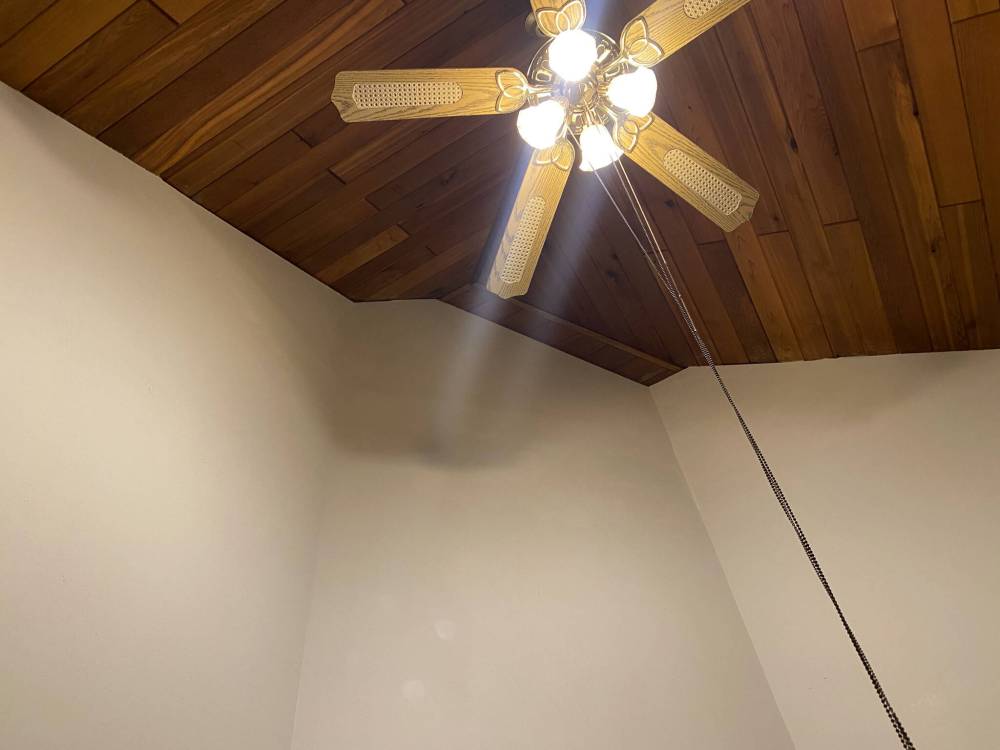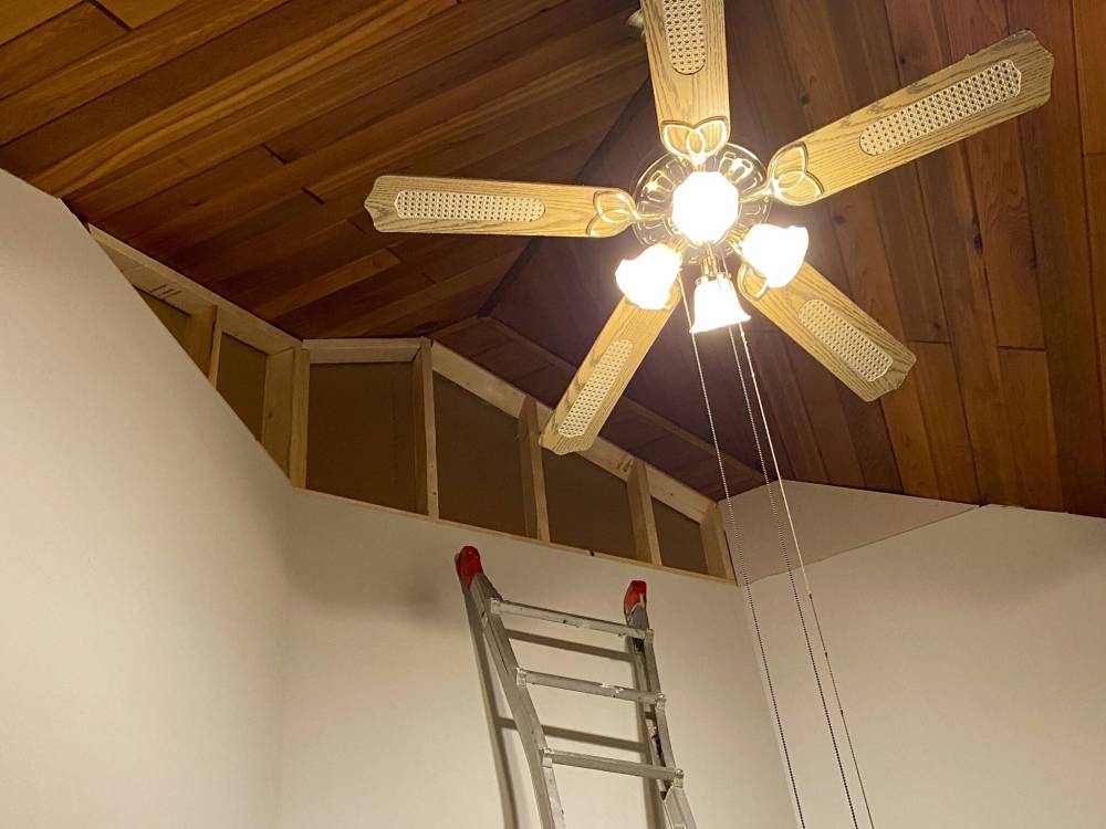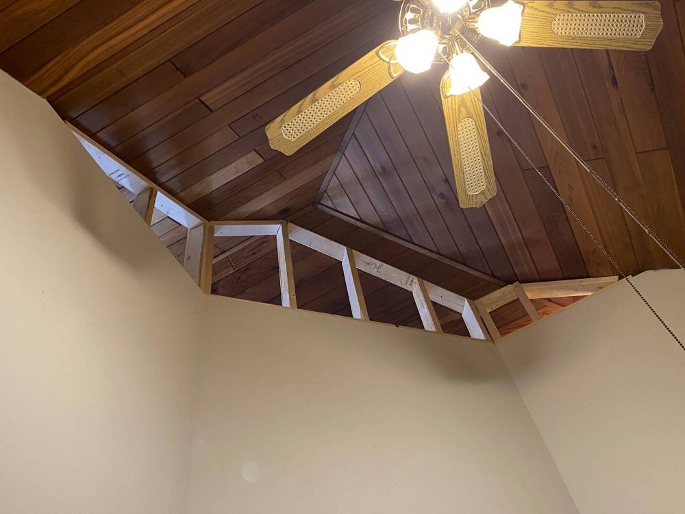 Achieving the same tasks on the master-bedroom side of the newly erected wall would prove more difficult. Using a 16-foot step ladder, the smaller corner piece was pre-cut and carried up in one hand while I climbed the ladder. Once the section was in position, a single screw would hold it in place until the entire piece was firmly fastened. Although the main middle section could have been cut as one piece, I elected to break it into two for safety purposes, as I hoisted and secured each piece individually.