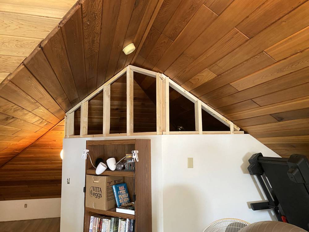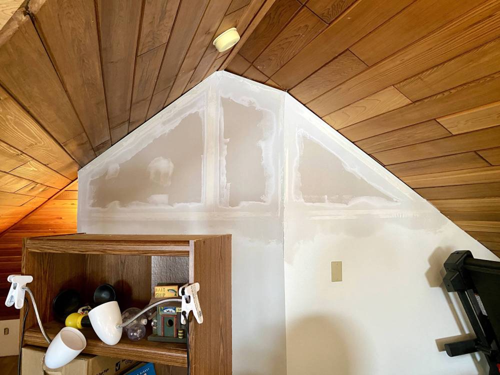 Once the structure was completely framed, drywall installation began. The sections of drywall along the second-floor side of the framing were relatively easy to mount, once the pieces were carefully cut to meet the ceiling angles.