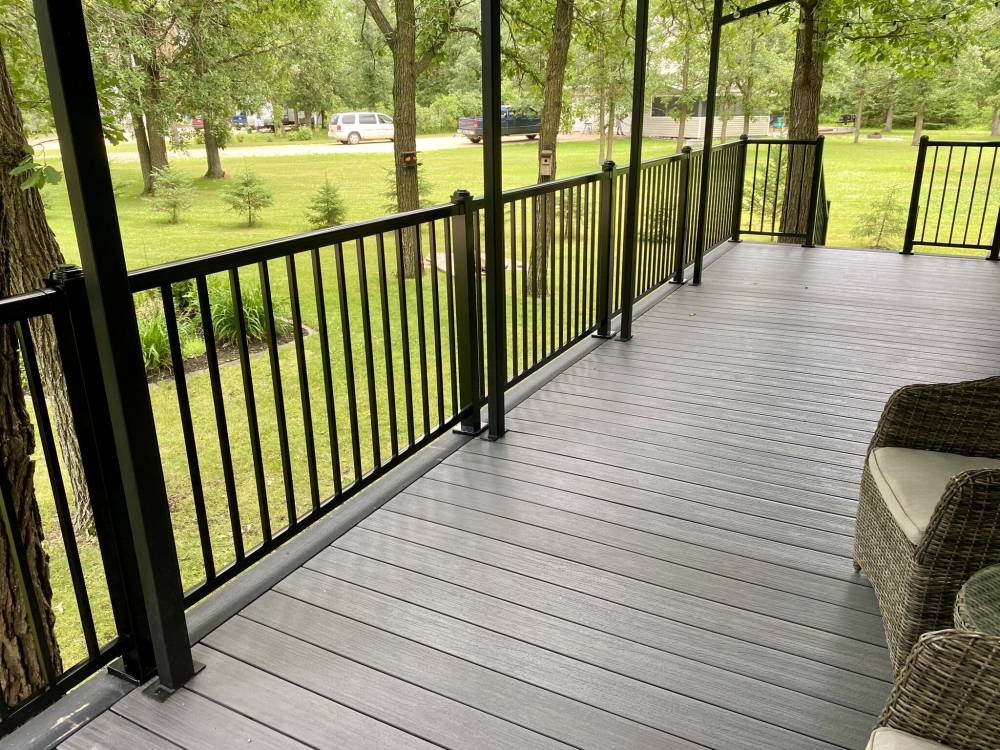 With the composite fully installed, the black aluminum railing was configured by first setting the posts at every corner in a pattern that matched the existing roof supports. The top and bottom railing horizontal supports were then placed into the post brackets, and aluminum pickets were installed, culminating in a vast improvement in both functionality and esthetics, which greatly increases the curb-appeal of this beautiful home.