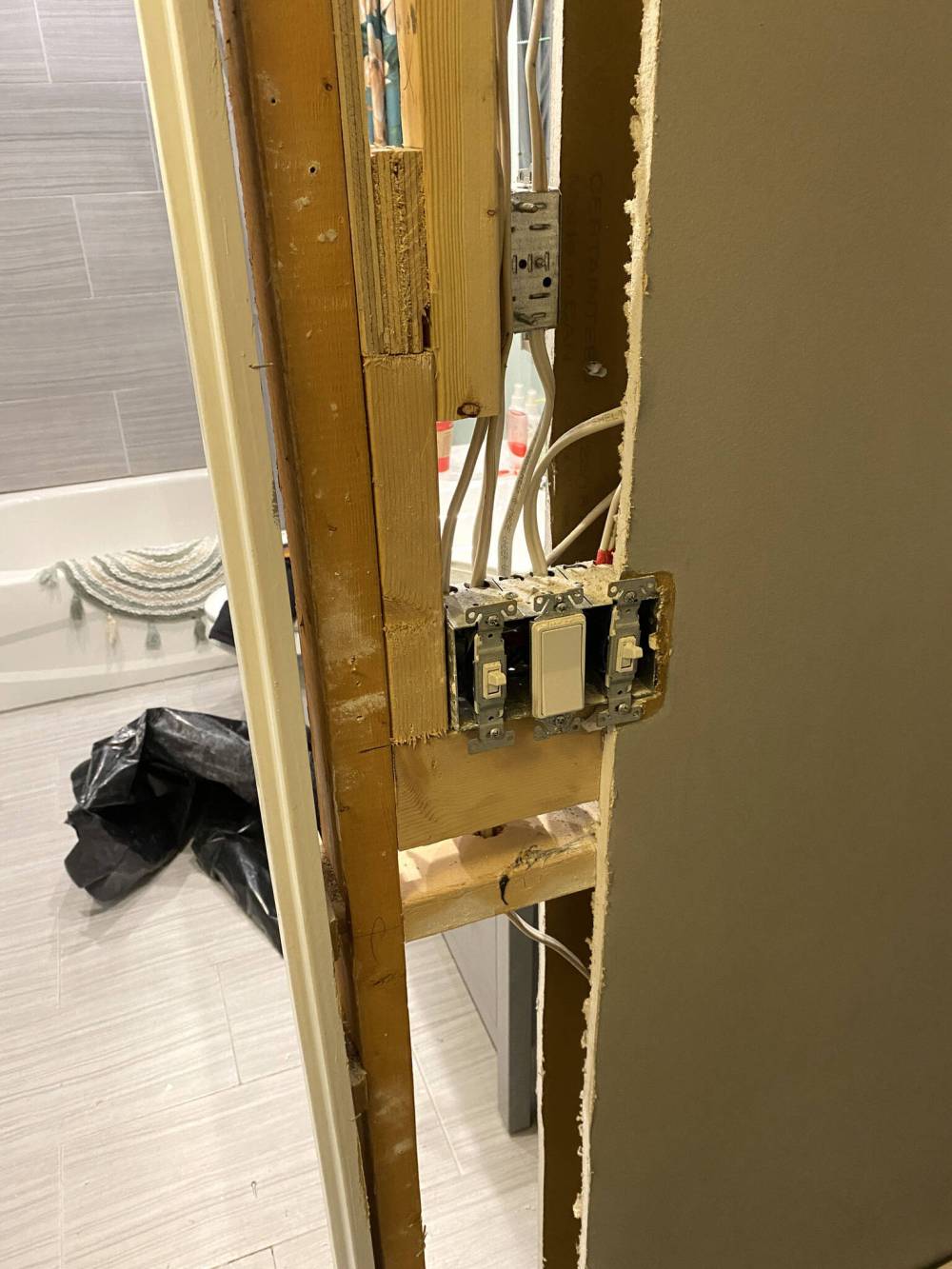 With the drywall removed exactly eight inches from the existing edge of the rough opening, the cross-brace framing below the switches was extracted — the stud was dislodged from the floor plate and cut in line with the top of the rough opening of the existing door. Careful measurements indicated the exact placement of the electrical boxes for the switch inside the bathroom, and the three switches facing the hallway.