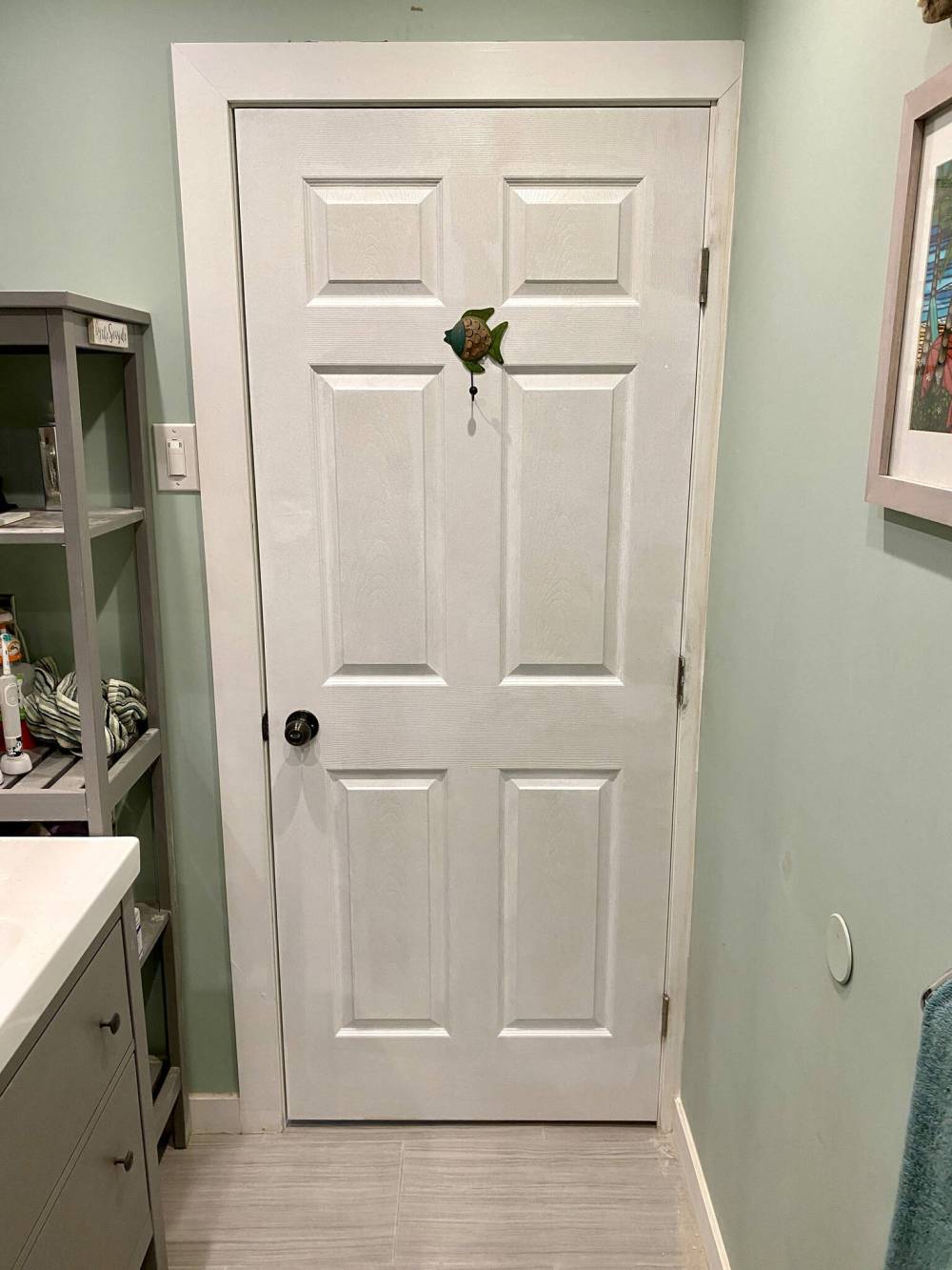 The door was primed and painted to match the other interior doors, and the doorknob from the old door was simply recycled and installed on the new door. The interior and exterior trim was then remounted, using new and matching longer sections above the wider door opening. And once the switch plates were re-installed, it truly looked as though the door had always been that wide.