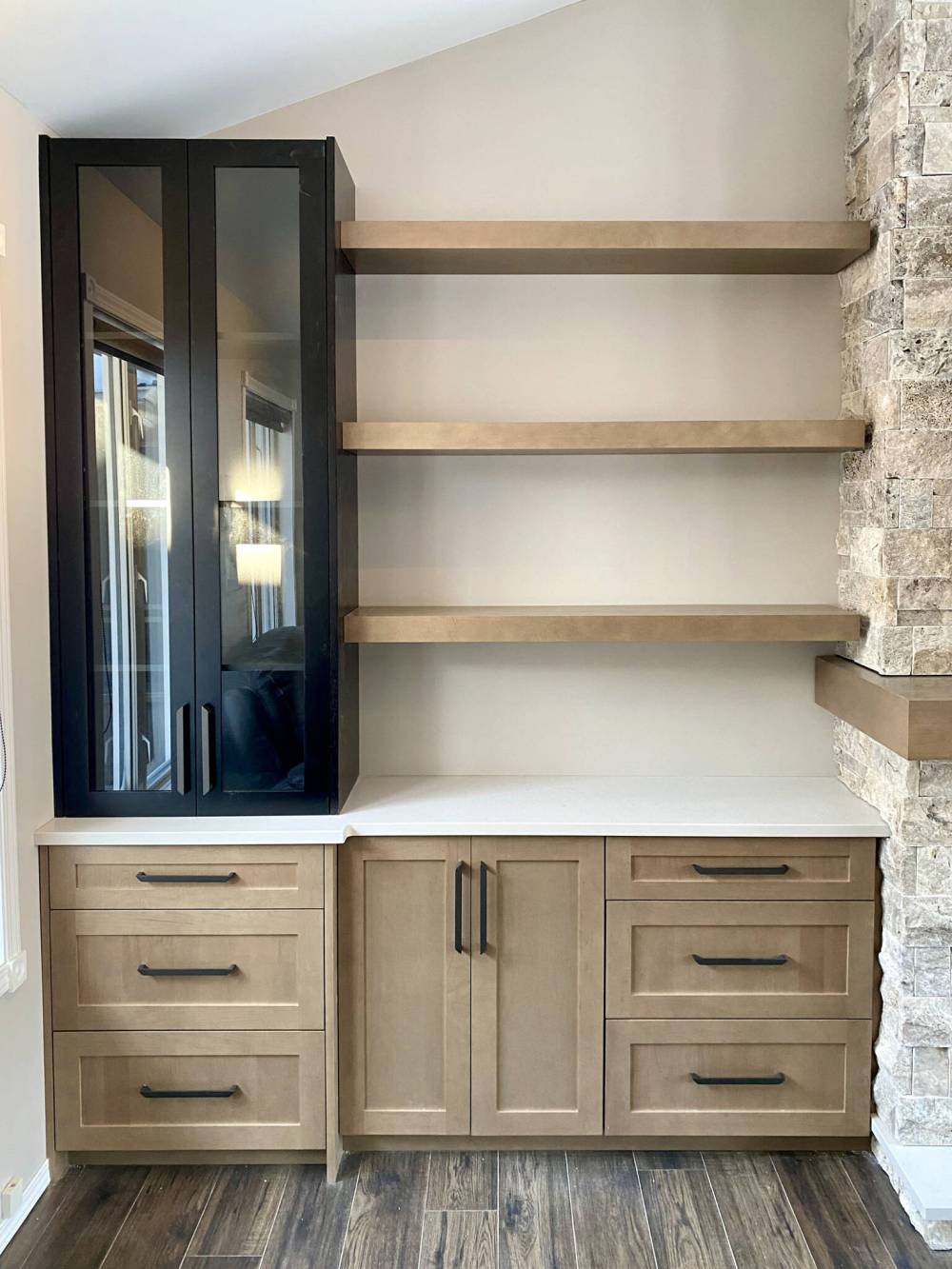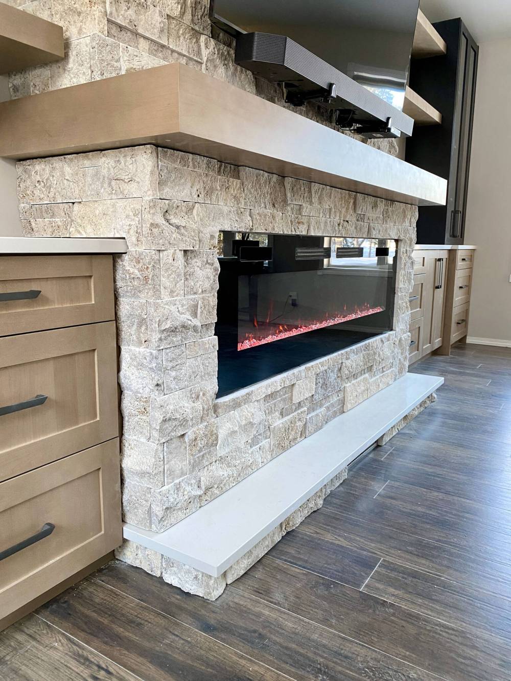 The final day proved most rewarding. The vertical cabinets showcasing glass doors were set atop the end of each quartz top. The darker colour blends nicely, and ties in the dark hue of both the fireplace and flatscreen. And to tie everything together nicely, three floating shelves set at equidistant elevations were mounted between the vertical cabs, and each side of the fireplace structure now decorated with stone.
