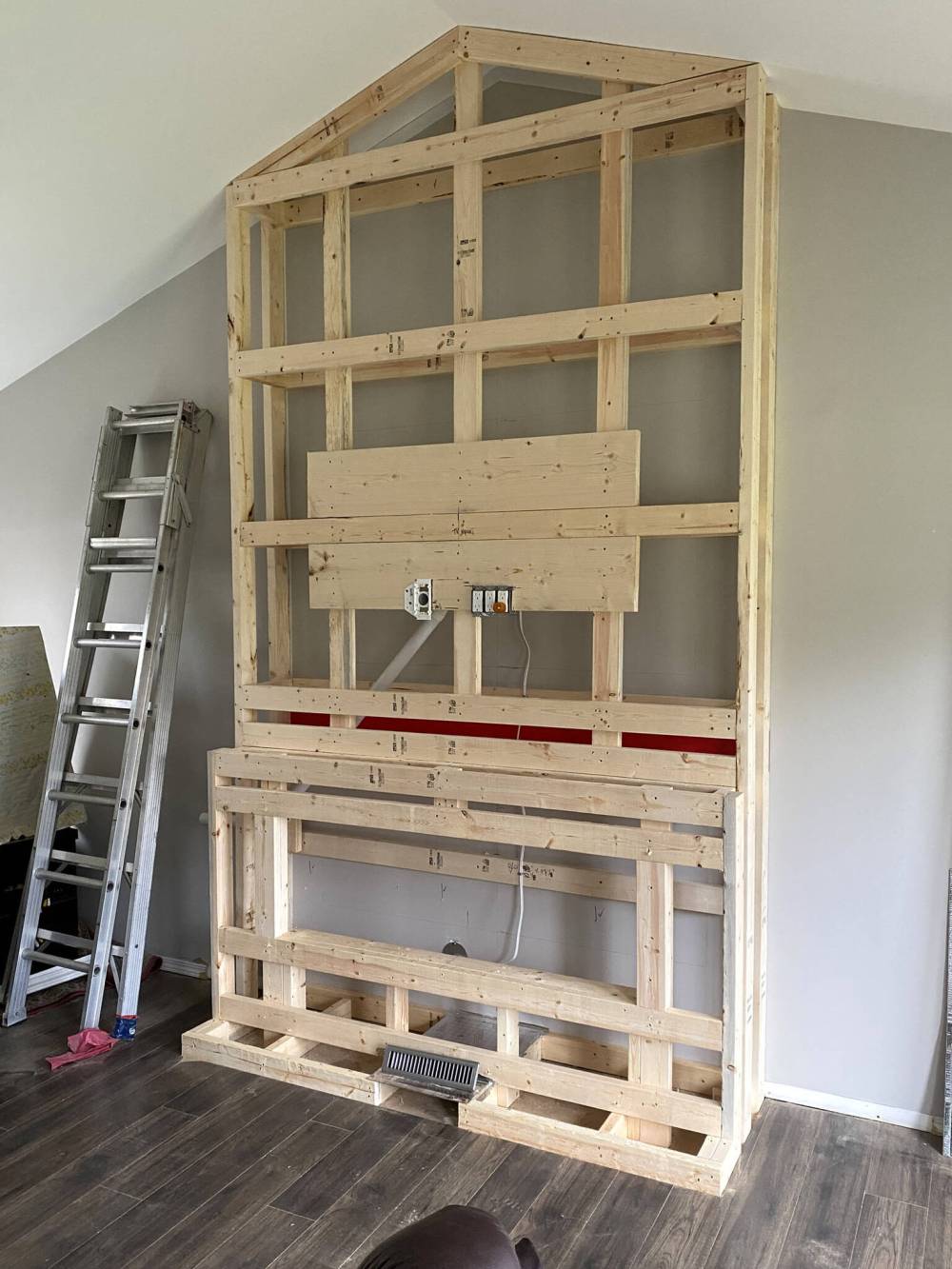 After the thumbs-up was received, Phase 2 began by framing the main fireplace stack structure in a tiered fashion, with the lowest area along the hearth having the greatest projection from the back wall, the mid-section that encases the fireplace place receded back slightly, and the upper portion to the ceiling being most slender above the mantle.
