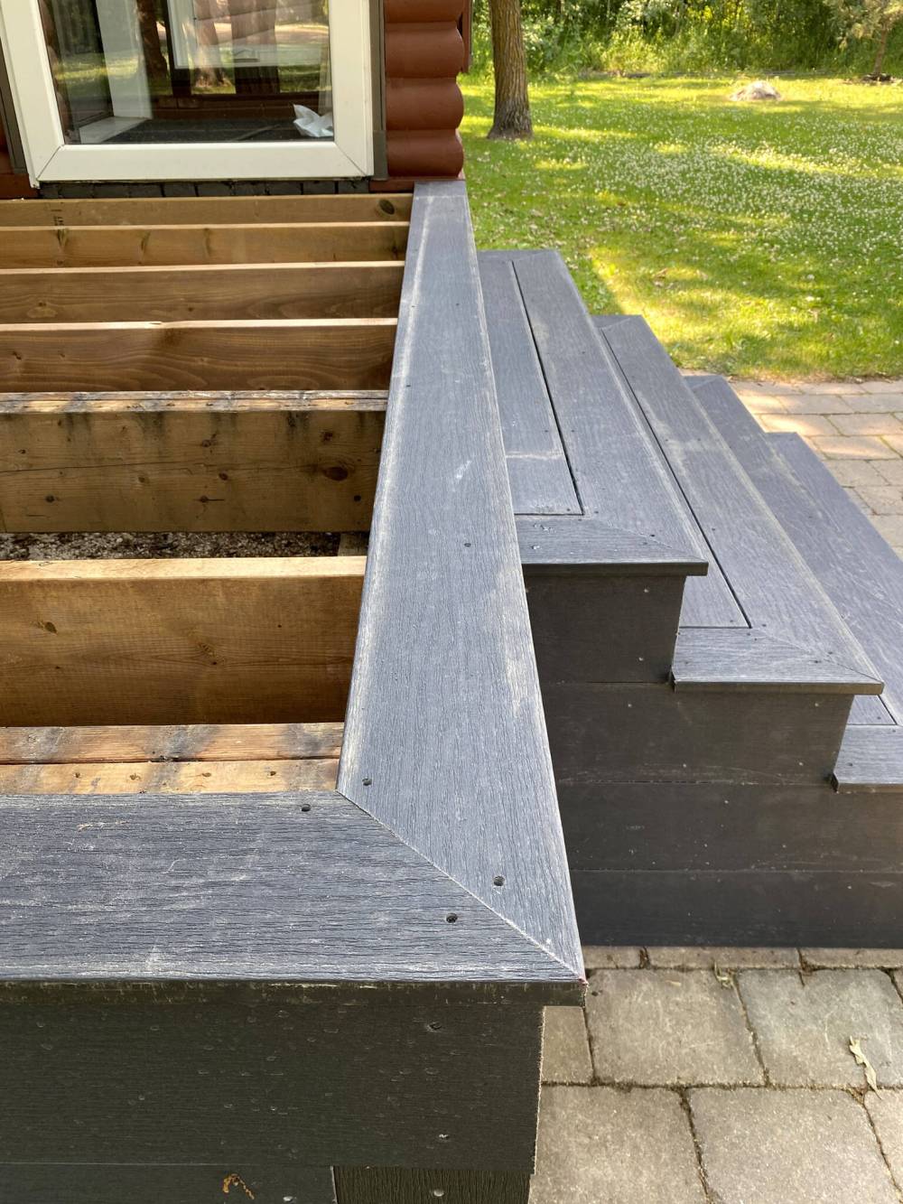 Composite decking is used to decoratively sheathe an existing balcony deck and staircase, with glass railings to be installed.