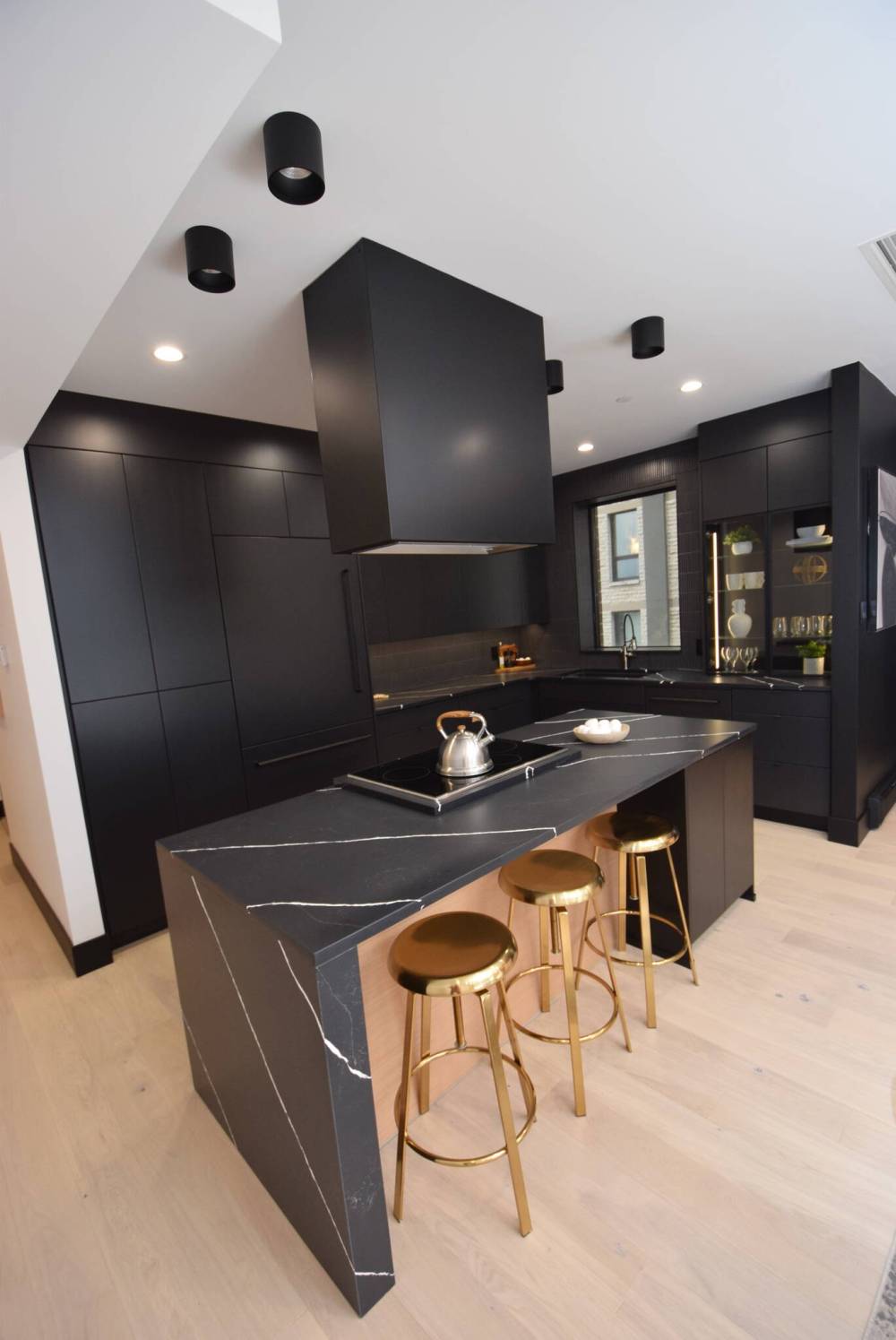 The island kitchen to the left starts things off in tasteful, modern style with a matte black quartz island with gorgeous white veins and matching waterfall sides.
